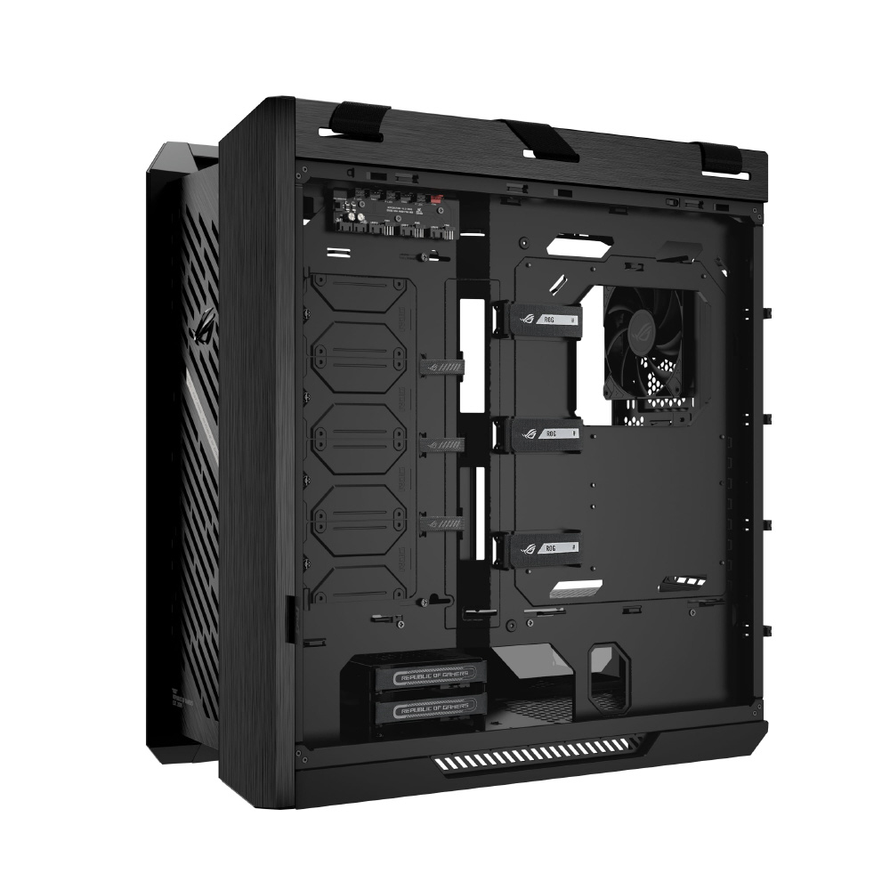 ROG Strix Helios II EATXミドルタワーゲーミングPCケース、両サイドパネルに強化ガラスを採用、最長450mmのGPUに対応、フレームとフロントパネルにアルミニウムを採用、GPUホルダー、420mmのラジエーターに対応