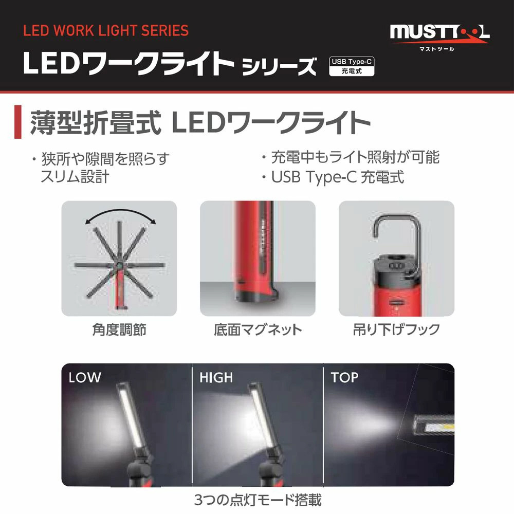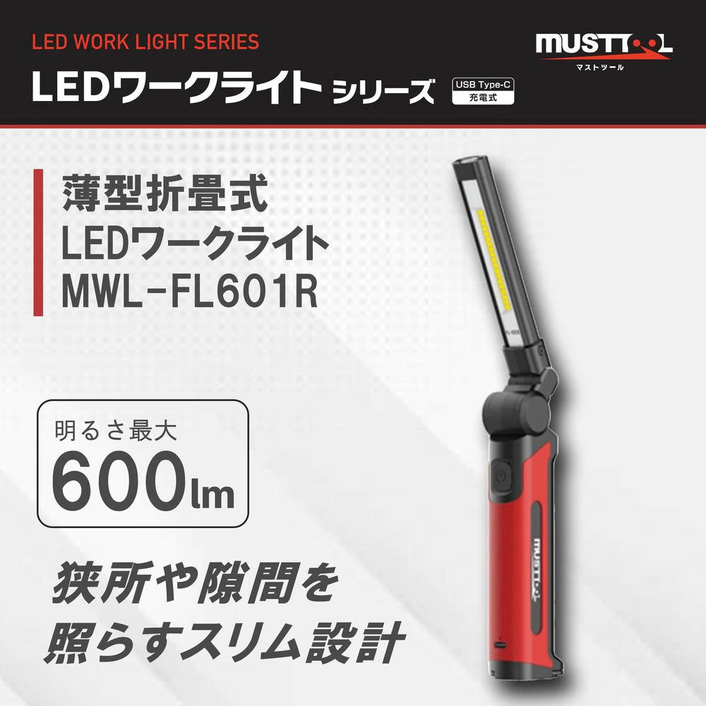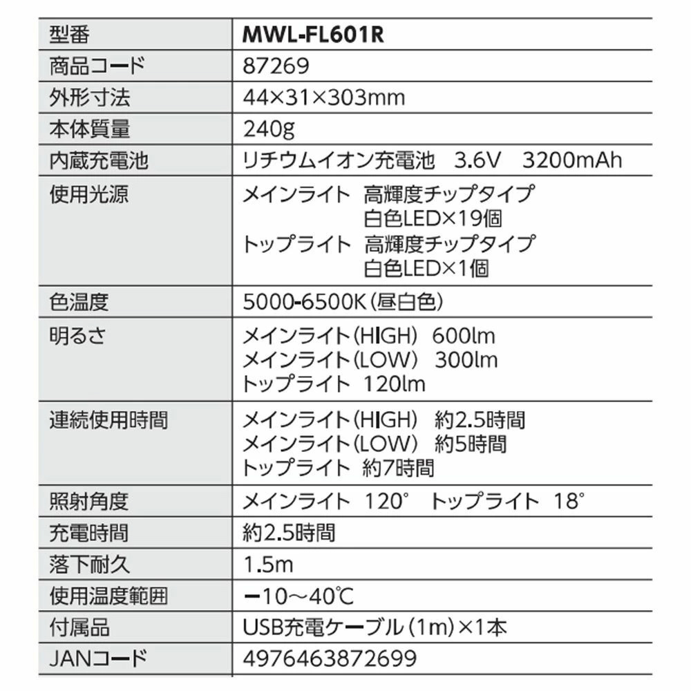 狭所作業+広範囲照射の両立。工場・倉庫・現場作業での常用ライト。災害やキャンプでのメインライト。