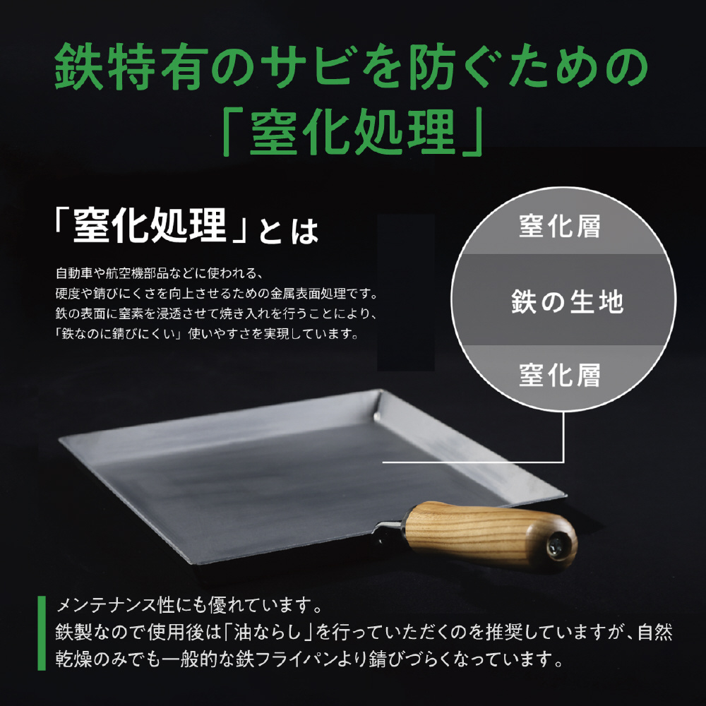 フライパンの外周部は刃物を使いやすいよう低めに設計し、表面には錆びにくい窒化処理を施すことで、メンテナンス性も向上。