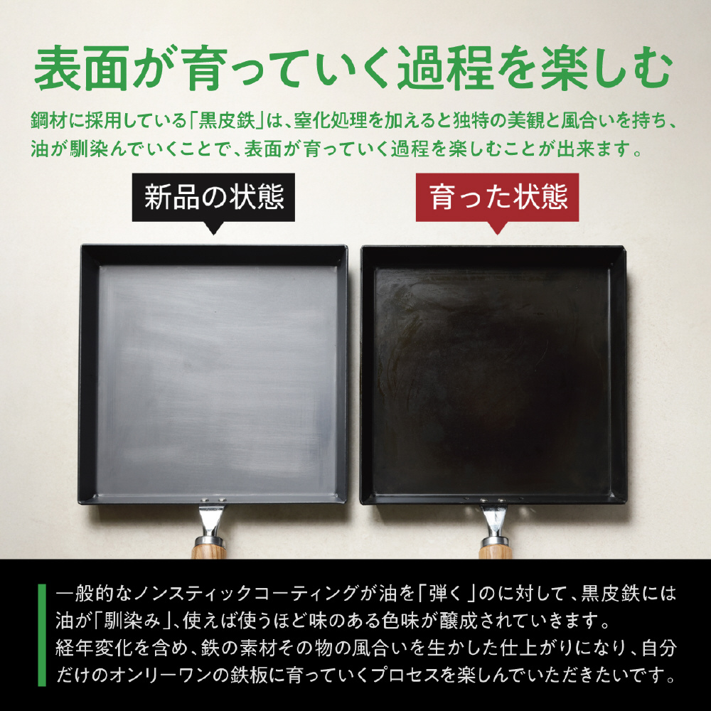 この鉄板は、一般的なフライパンとは異なり、24cm四方の正方形というユニークな形状をしています。