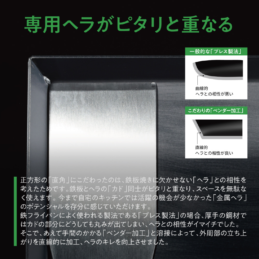 特に直角にこだわったことで、ヘラと鉄板のカドがぴったりと合い、スペースを有効活用できます。
