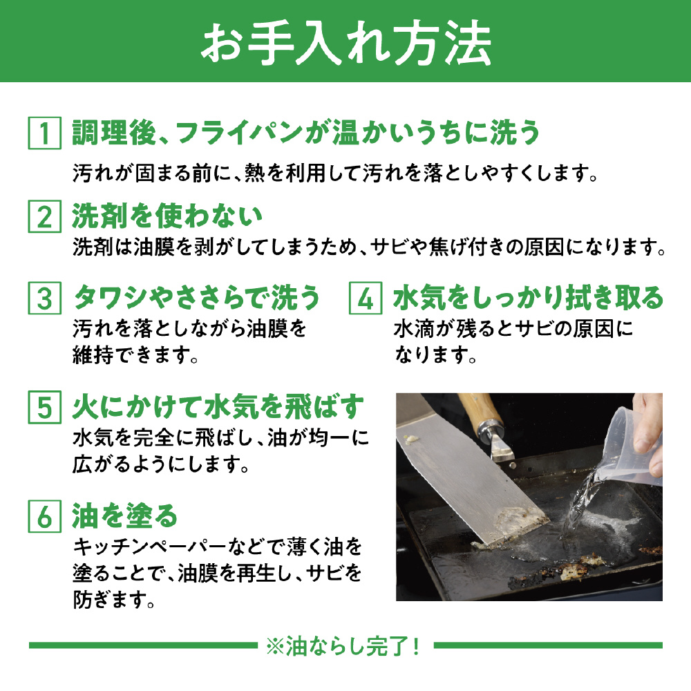 鉄製なので油ならし推奨ですが、自然乾燥でも錆びにくい仕様です。