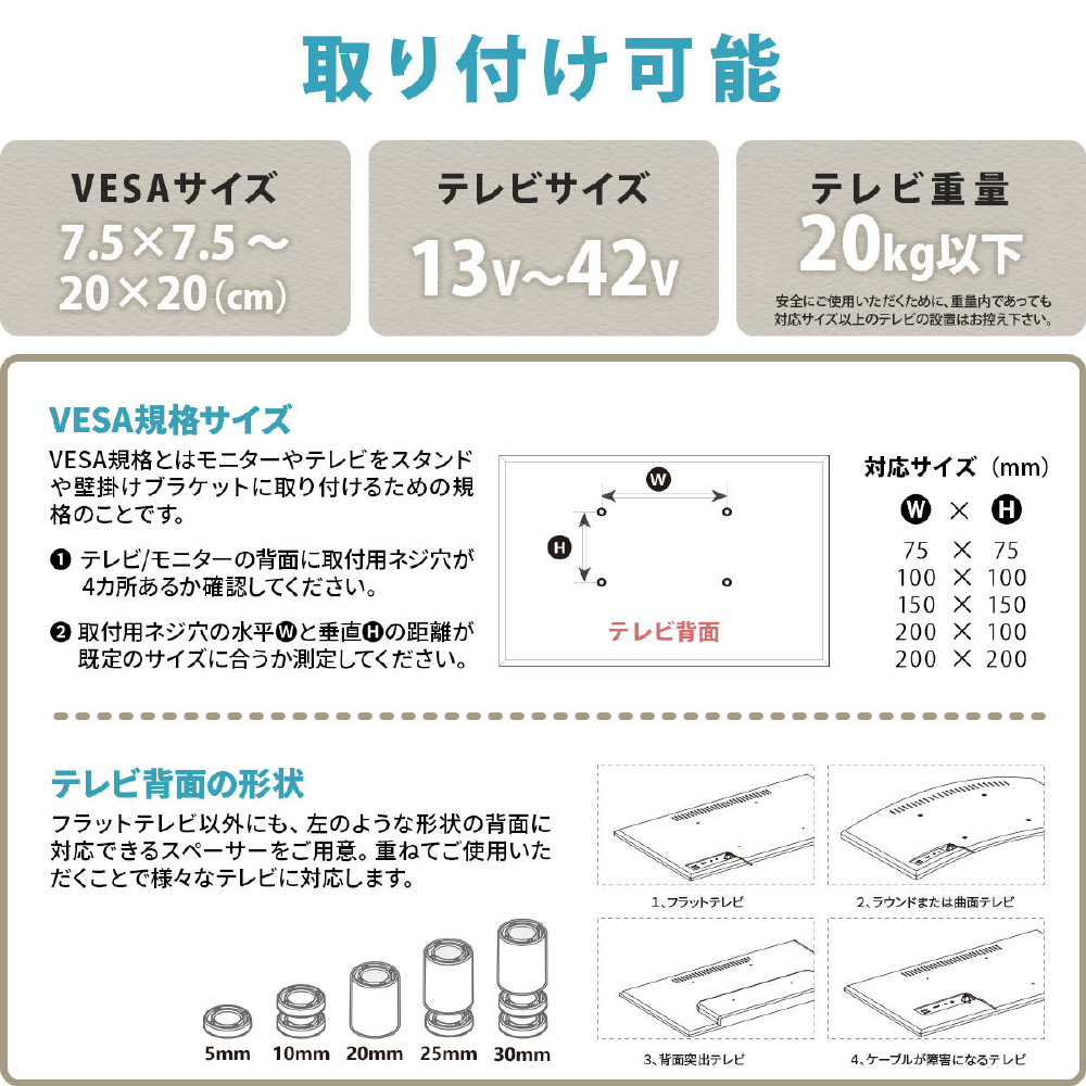 ■素材:スチール(粉体塗装) 【対応テレビ】13-42型 【対応VESA】75×75mm〜200×200mm