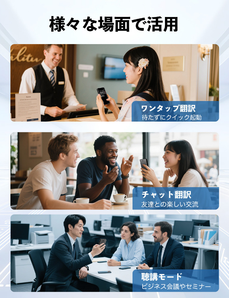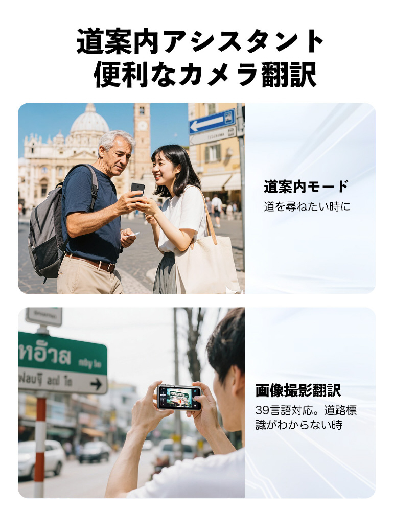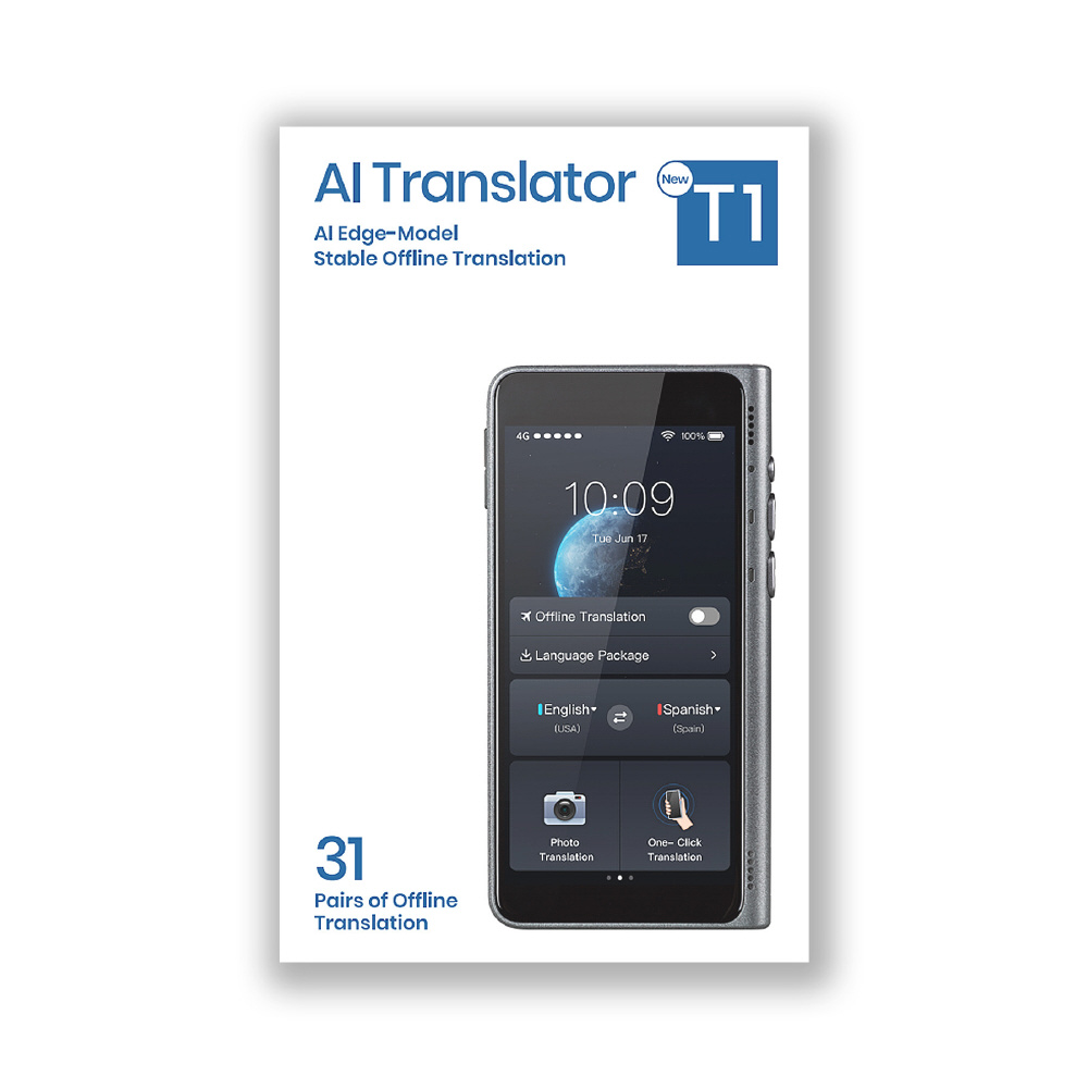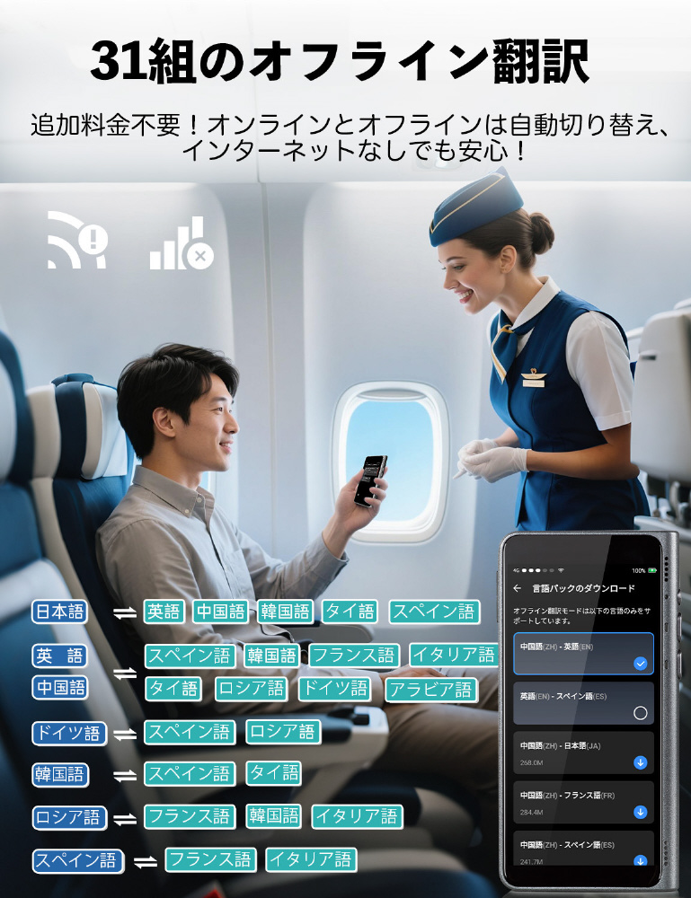 新発売T1音声翻訳機はエッジAIモデル搭載、ネットワーク接続不要の95%精度リアルタイム翻訳を実現。従来比30%向上したオフライン翻訳エンジンを搭載し、山岳地帯・海上・密林など通信困難な環境でも途切れない翻訳を提供。通信状況を自動検知、オフライン/オンラインモードをシームレスに切り替えることで、ネットワークの有無にかかわらず安定した翻訳パフォーマンスを維持。 31組オフライン翻訳対応、グローバル通信2年付き:SIMカード不要!ネットワーク接続無しで、31組のオフライン翻訳をサポートします。