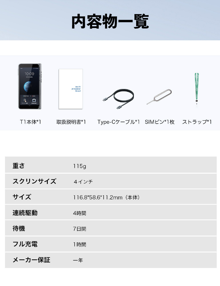 付属品 T1 本体、Type-C充電ケーブルx1、ストラップ、取扱説明書