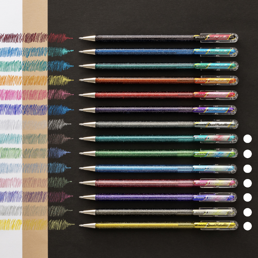 白い紙では鮮やかに、黒などの濃く深い色の紙ではグリッターの輝きがきわだち幻想的に、1本で多彩な表現をお楽しみいただけます。
