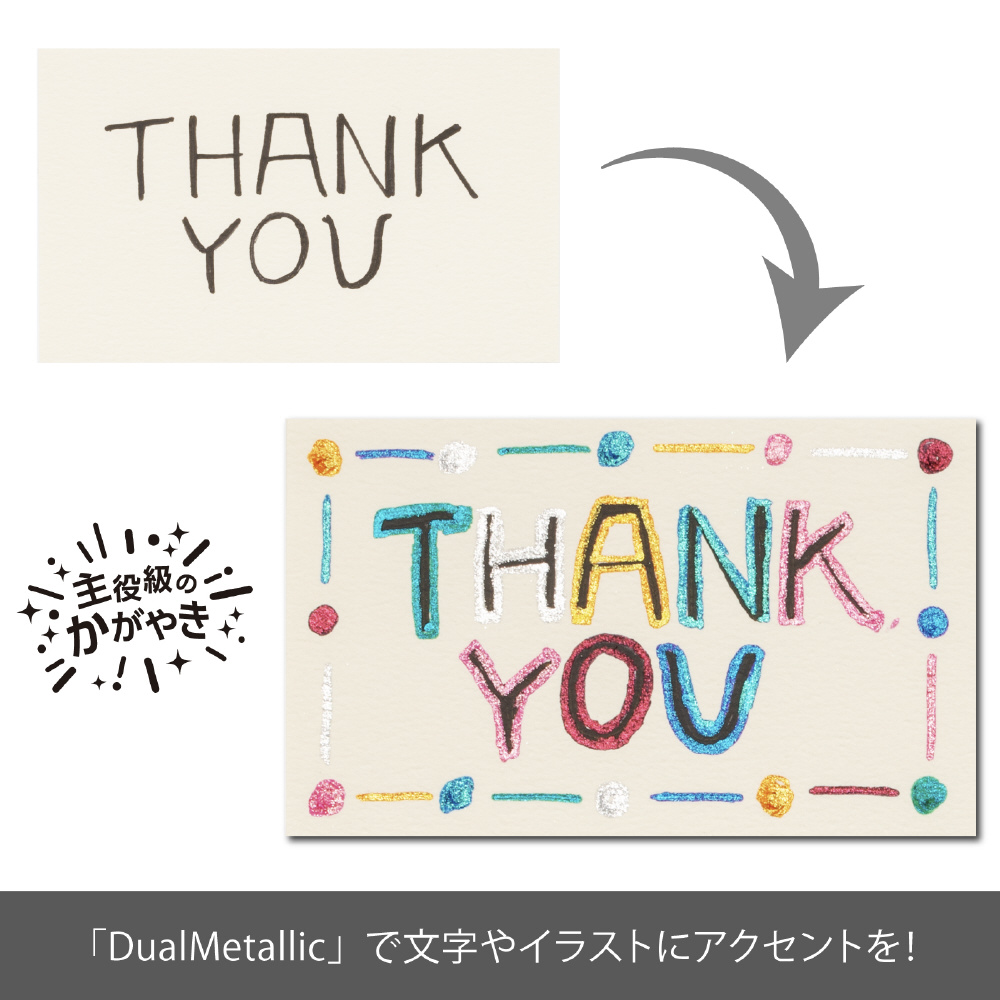 白い紙では鮮やかに、黒などの濃く深い色の紙ではグリッターの輝きがきわだち幻想的に、1本で多彩な表現をお楽しみいただけます。