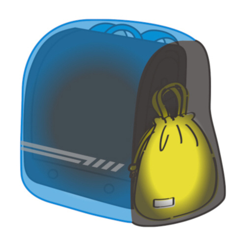 ランドセル用のレインカバーです。はっ水加工で雨を弾きランドセルを守ります。カバーと一体型の収納袋でランドセルに付けたままま簡単に出し入れできます。のびる生地なのでランドセルに補助バックや給食袋などを付けたままかぶせることができます。