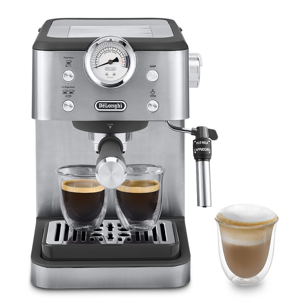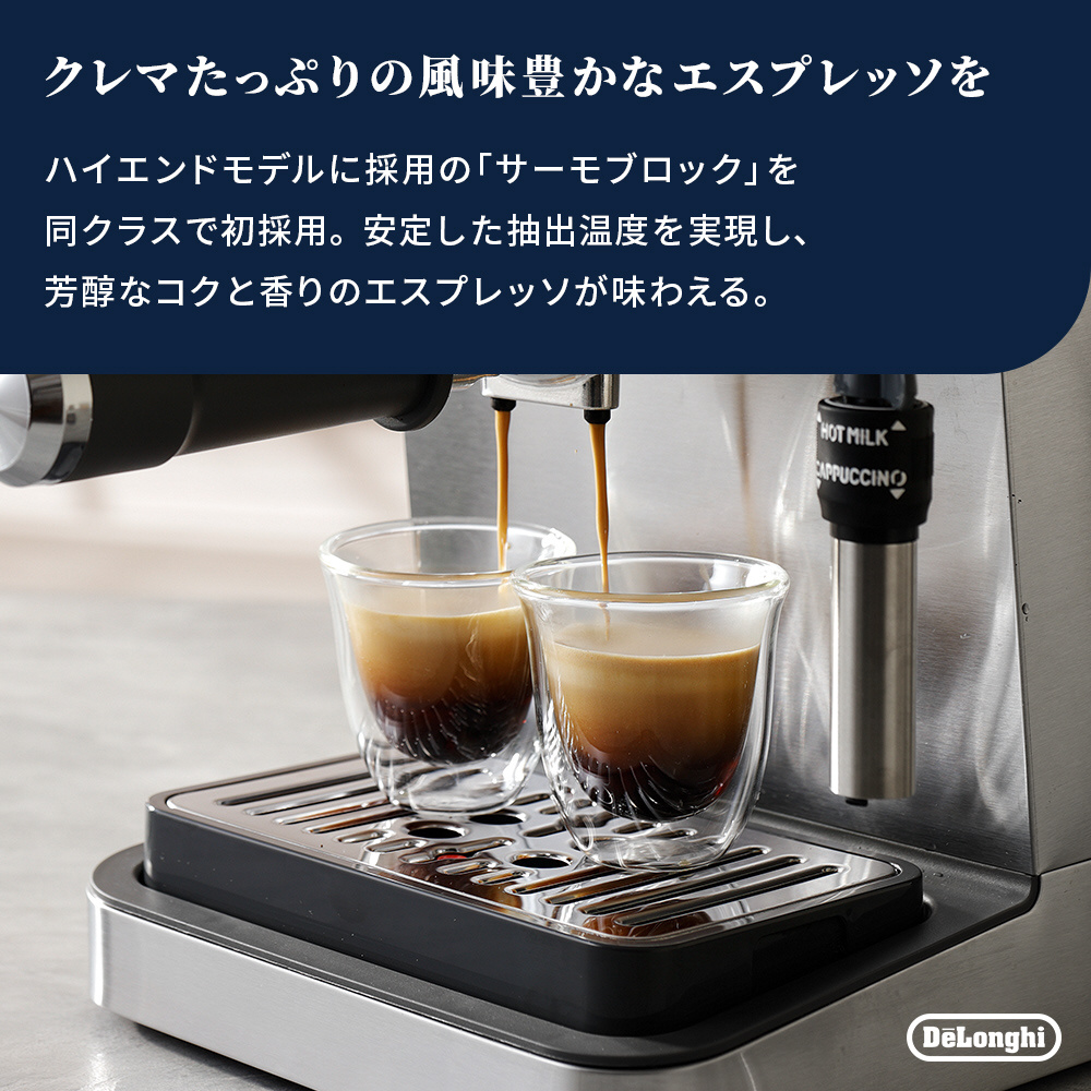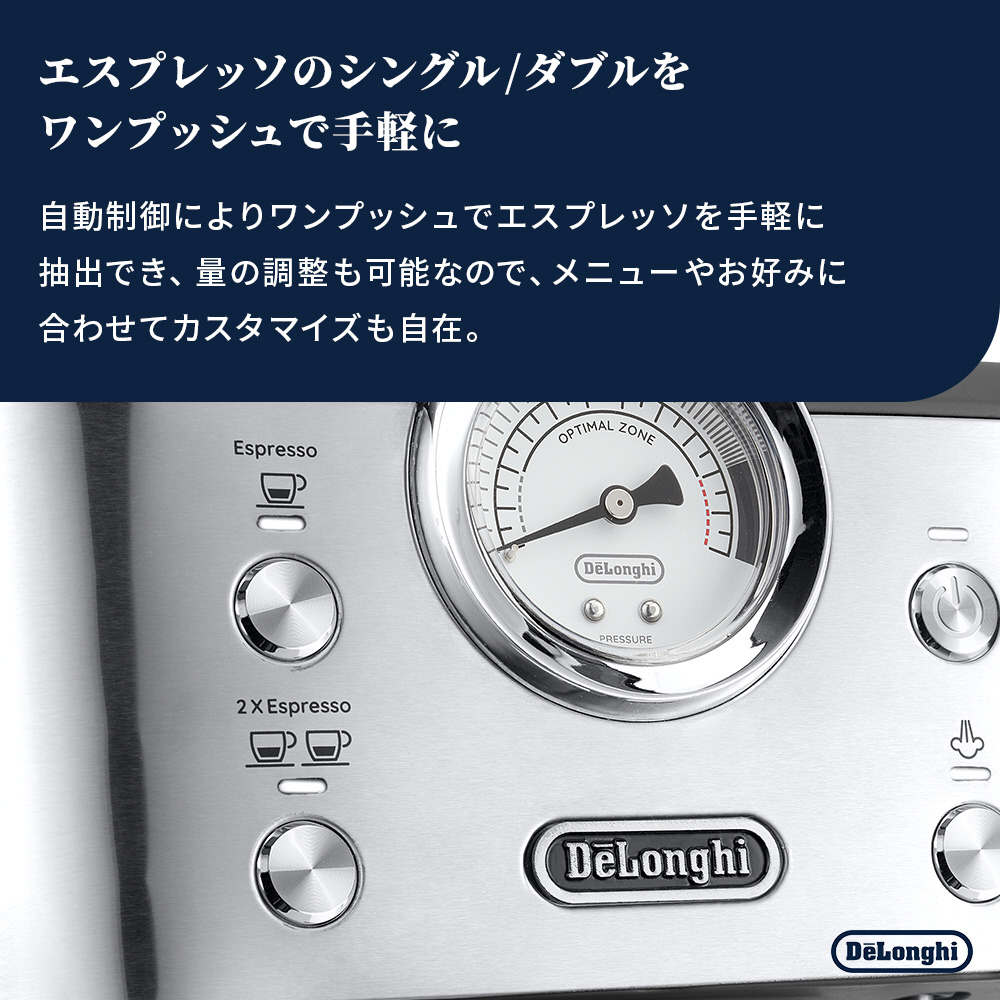クレマたっぷりのエスプレッソやふわふわのフォームミルクを自分好みにこだわりながらラテやカプチーノも楽しめるエスプレッソ・カプチーノメーカー。メタリックで上質感のあるイタリアンデザインが部屋やキッチンを彩りながら、抽出具合が分かる圧力計や調整つまみ付きフロッサーで理想の一杯を追求できます。