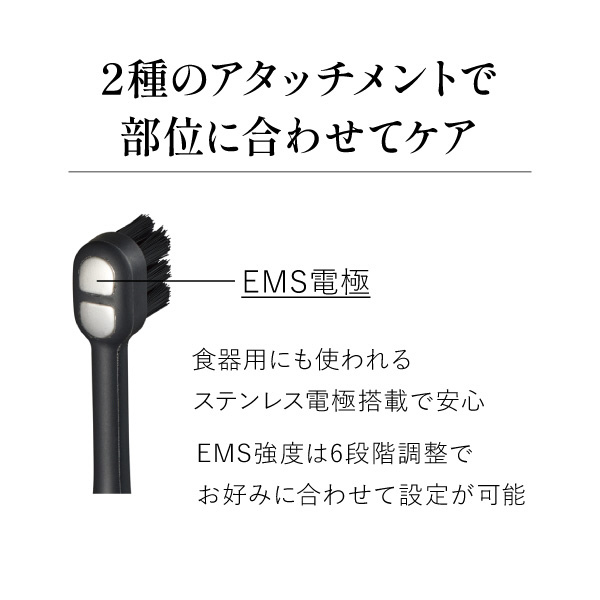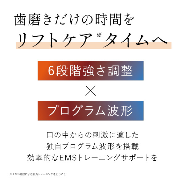 歯ブラシの背面にはEMS電極を搭載。電極から出力されるEMSが口腔内から筋肉を刺激するため、歯を磨きながら表情筋のケアが可能です。EMSは口腔内からの深層表情筋の刺激に適したプログラム波形を採用し、効率的なEMSトレーニングを叶えます。レベルは6段階で、口腔内の状態やお好みに合わせて調節できます。
