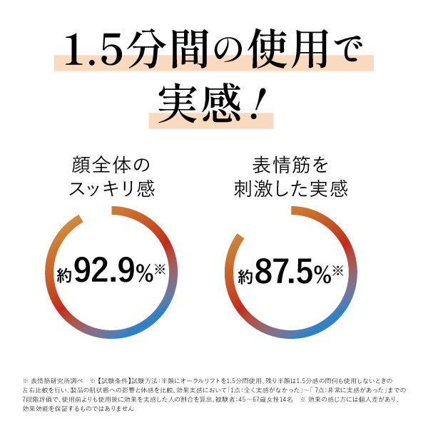 30秒経つと短く振動し、1分経つと長く振動するため、口腔内から効率よくリフトケア*2する時間の目安をお知らせします(EMSモード)。さらに、10分のオートオフ機能付きで、適切なケア時間を管理し、オーバートリートメントを防ぎます。