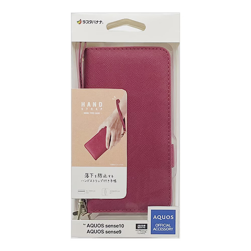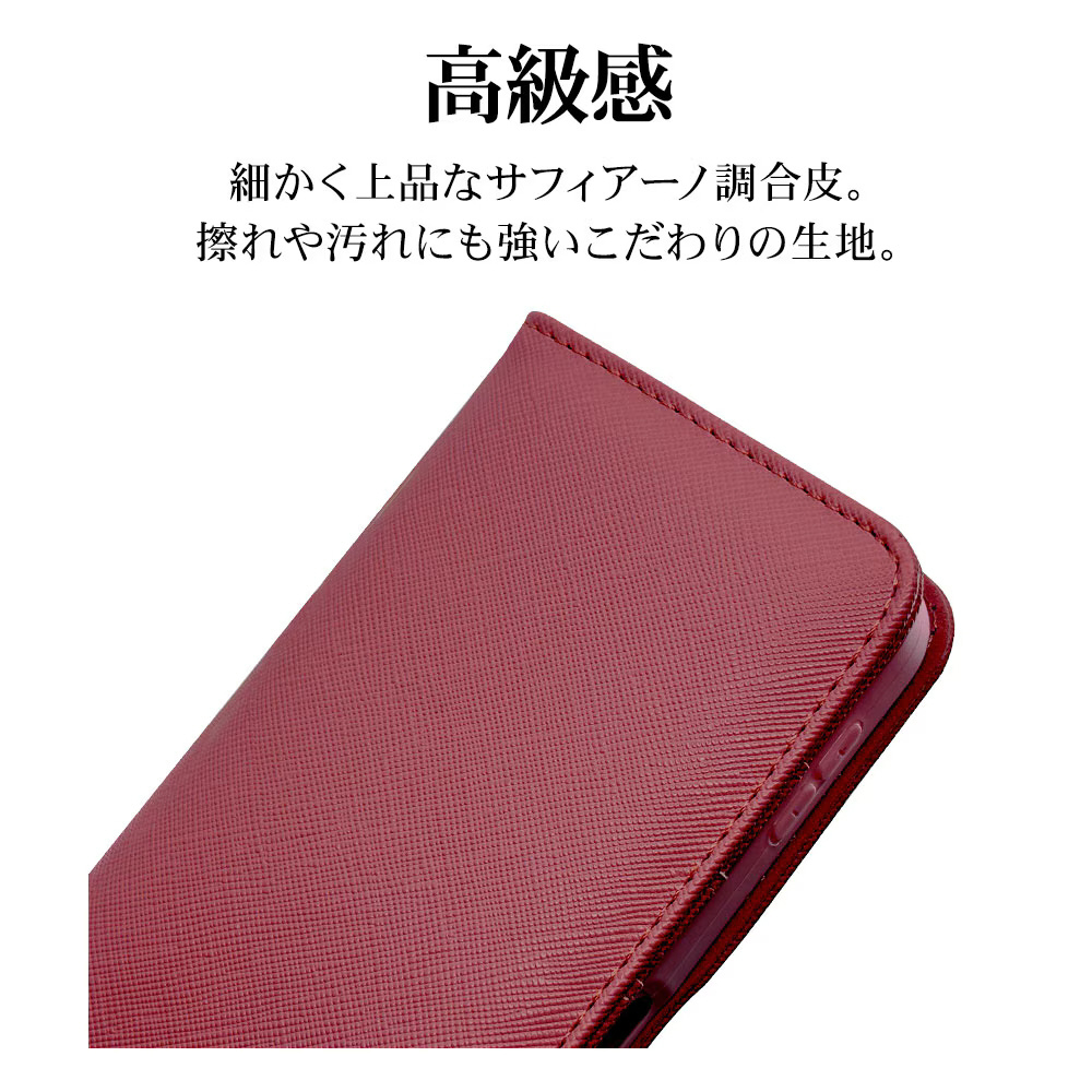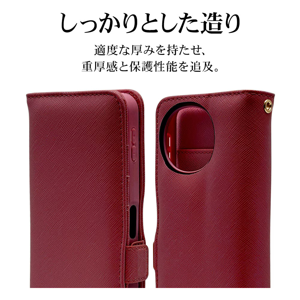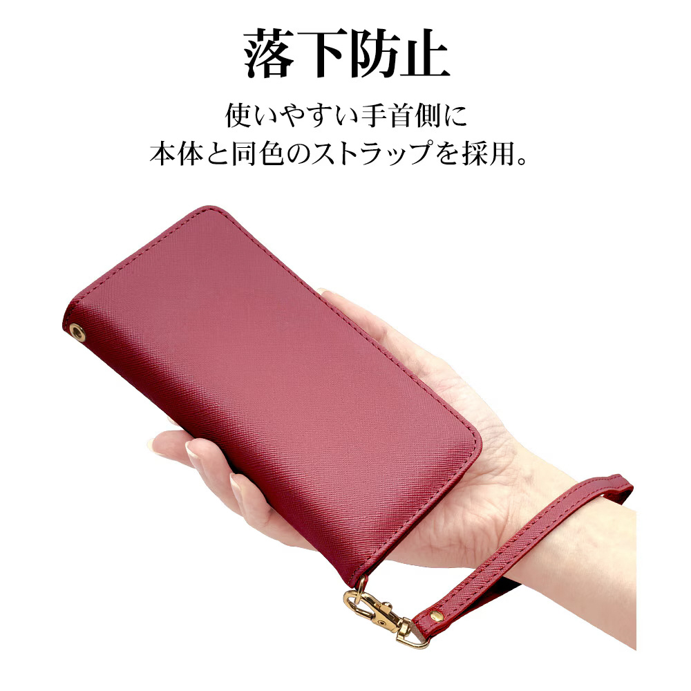 液晶画面側と背面側の両面を保護できるハンドストラップ付きの手帳型ケースです。