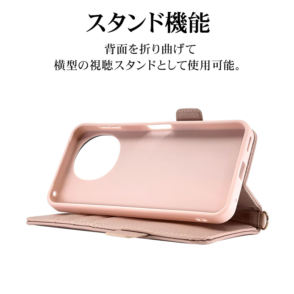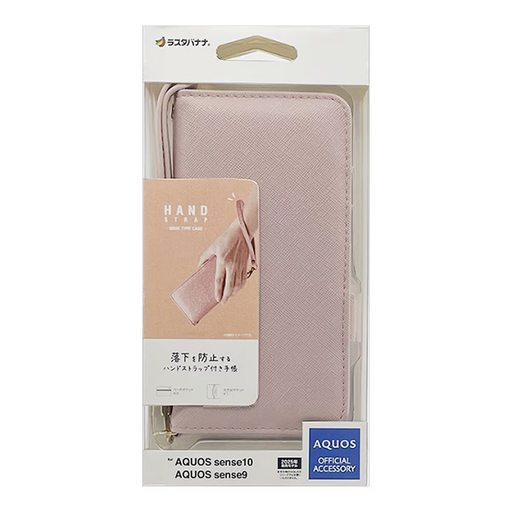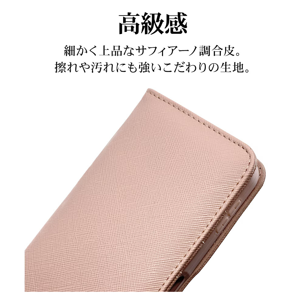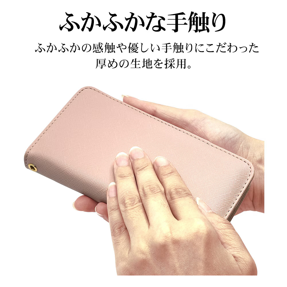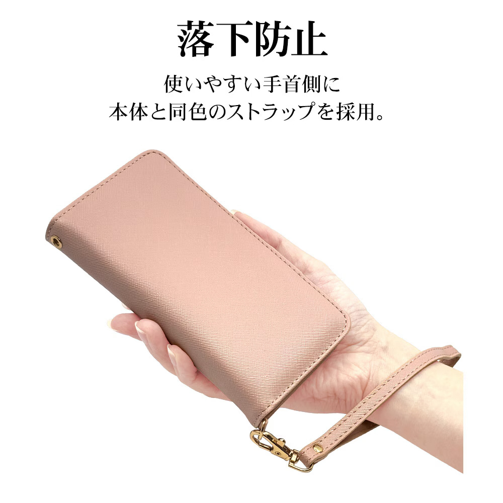 液晶画面側と背面側の両面を保護できるハンドストラップ付きの手帳型ケースです。