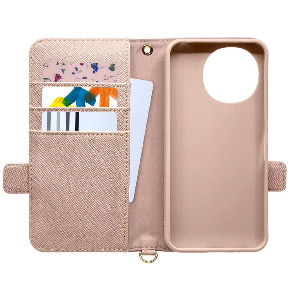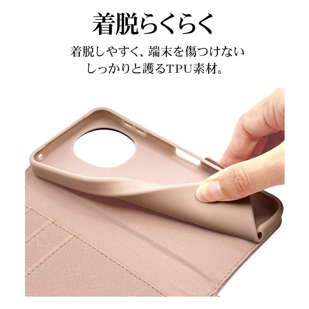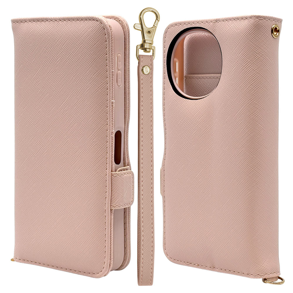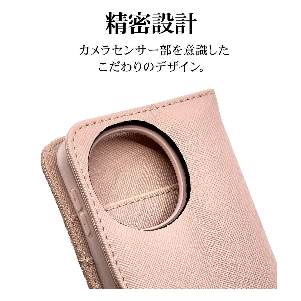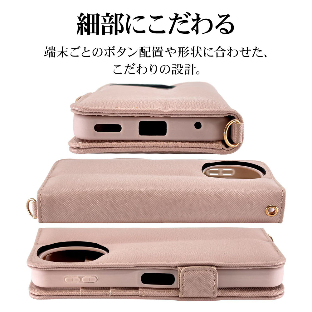 液晶画面側と背面側の両面を保護できるハンドストラップ付きの手帳型ケースです。