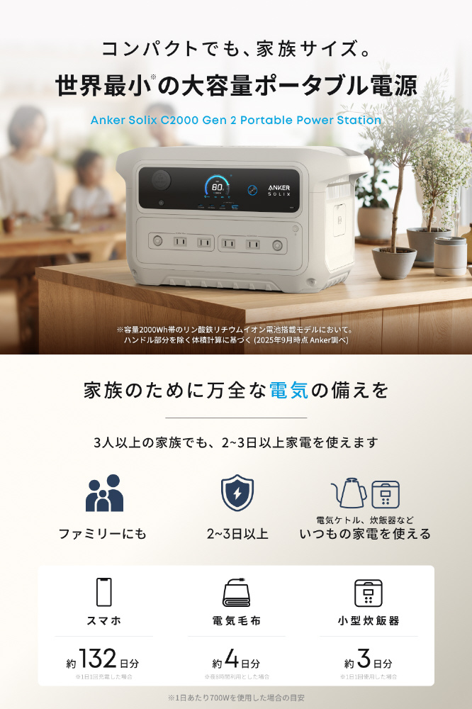 2000Wh帯で世界最小※1サイズを実現。変換効率を改善し、一般的な2000Wh帯より最大約3倍※2長く家電を使える。Anker独自の急速充電技術HyperFlashにより、100%満充電までわずか99分。家族の防災に万全の備えが欲しい方に最適な大容量モデルです。※1 容量2000Wh帯のリン酸鉄リチウムイオン電池搭載モデルにおいて。ハンドル部分を除く体積計算に基づく (2025年9月時点 Anker調べ)※2 一般的な2000Wh帯のポータブル電源とLEDライトの使用時間で比較した場合。充電回数は各機器の定格消費電力に基づく計算上の数値 (Anker調べ) 。ご使用の機器の消費電力や使用状況により変動します