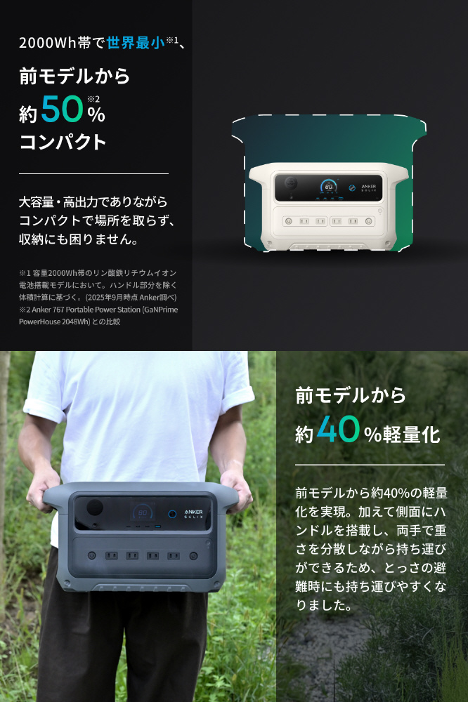 前モデル※2からサイズは約50%、重さは約40%軽量化しコンパクトに。加えて両側面にハンドルを搭載し、両手で重さを分散することができるため、とっさの避難時にも持ち運びやすくなりました。※1 容量2000Wh帯のリン酸鉄リチウムイオン電池搭載モデルにおいて。ハンドル部分を除く体積計算に基づく (2025年9月時点 Anker調べ)※2 Anker 767 Portable Power Station (GaNPrime PowerHouse 2048Wh) との比較
