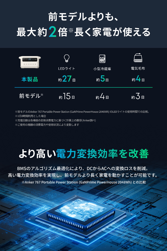 BMSのアルゴリズム最適化により、DCからACへの変換ロスを削減することで、高い電力変換効率を実現しました。これにより前モデルよりも長く家電を動かすことが可能です。 ※LEDライトの使用時間で比較した場合 ※Anker 767 Portable Power Station (GaNPrime PowerHouse 2048Wh)との比較。充電回数は各機器の定格消費電力に基づく計算上の数値 (Anker調べ) ※ご使用の機器の消費電力や使用状況により変動します