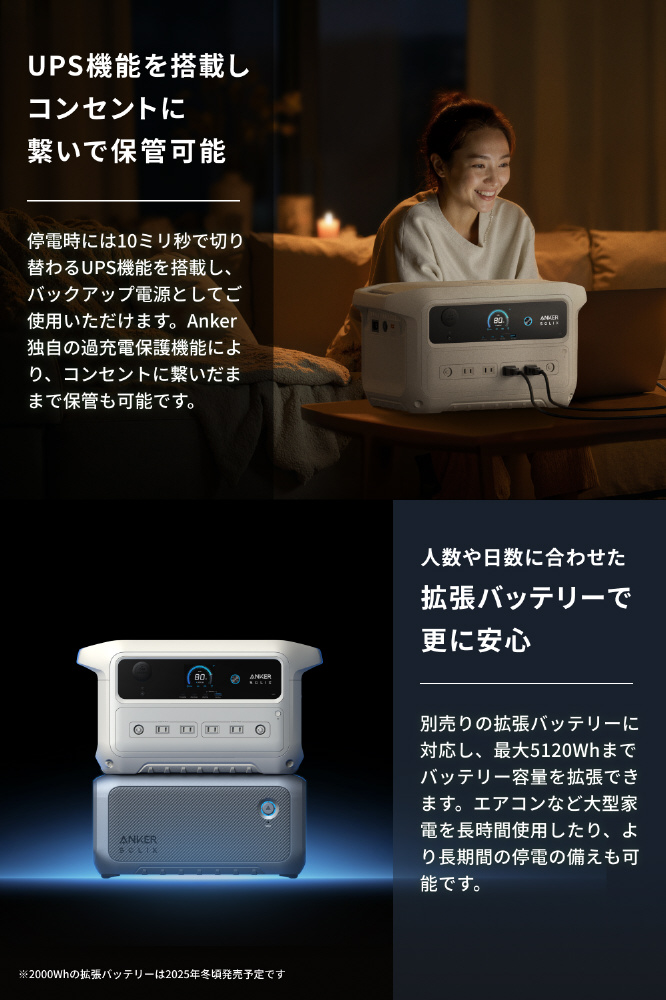 別売りの拡張バッテリーに対応し、最大5120Whまでバッテリー容量を拡張できます。エアコンなど大型家電を長時間使用したり、より長期間の停電の備えも可能です。※2000Whの拡張バッテリーは2025年冬頃発売予定です