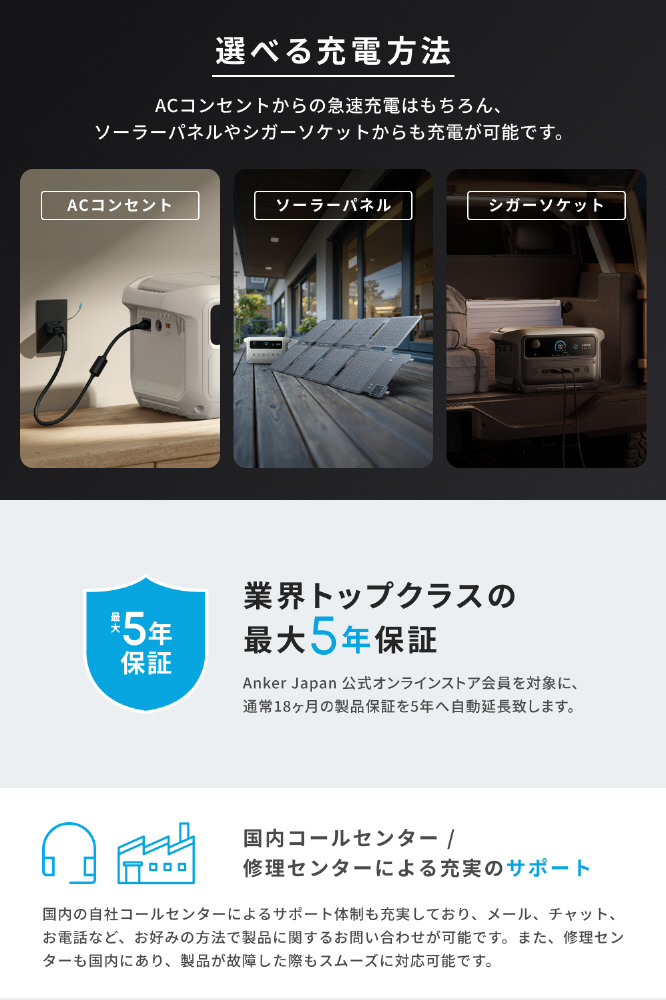 ACコンセントからの急速充電はもちろん、ソーラーパネルやシガーソケットからも充電が可能です。