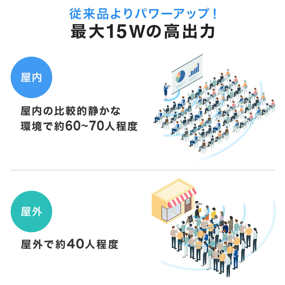 ●音響設備等が必要なく、誰でも簡単に声を拡声出力できます。15Wの高出力対応でマスク等で声量が出せない場合にも手軽に声量アップできます。