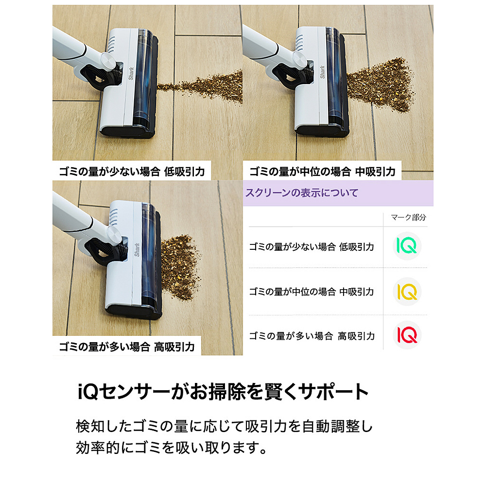 ■iQセンサーがゴミの量に合わせて吸引力を自動調整することで、効率的にお掃除できる