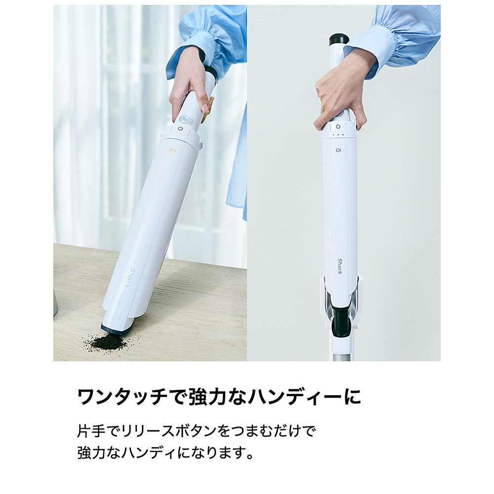 ■片手でリリースボタンをつまむだけで強力なハンディに。ボタンを押すだけでゴミ捨てが簡単。ゴミも飛び散りづらく、手を汚すことなく衛生的