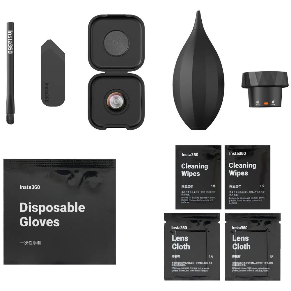 Insta360 X4 Air 純正交換レンズ1枚と、ご自宅でのレンズ交換やクリーニングに必要なツール一式が付属します。