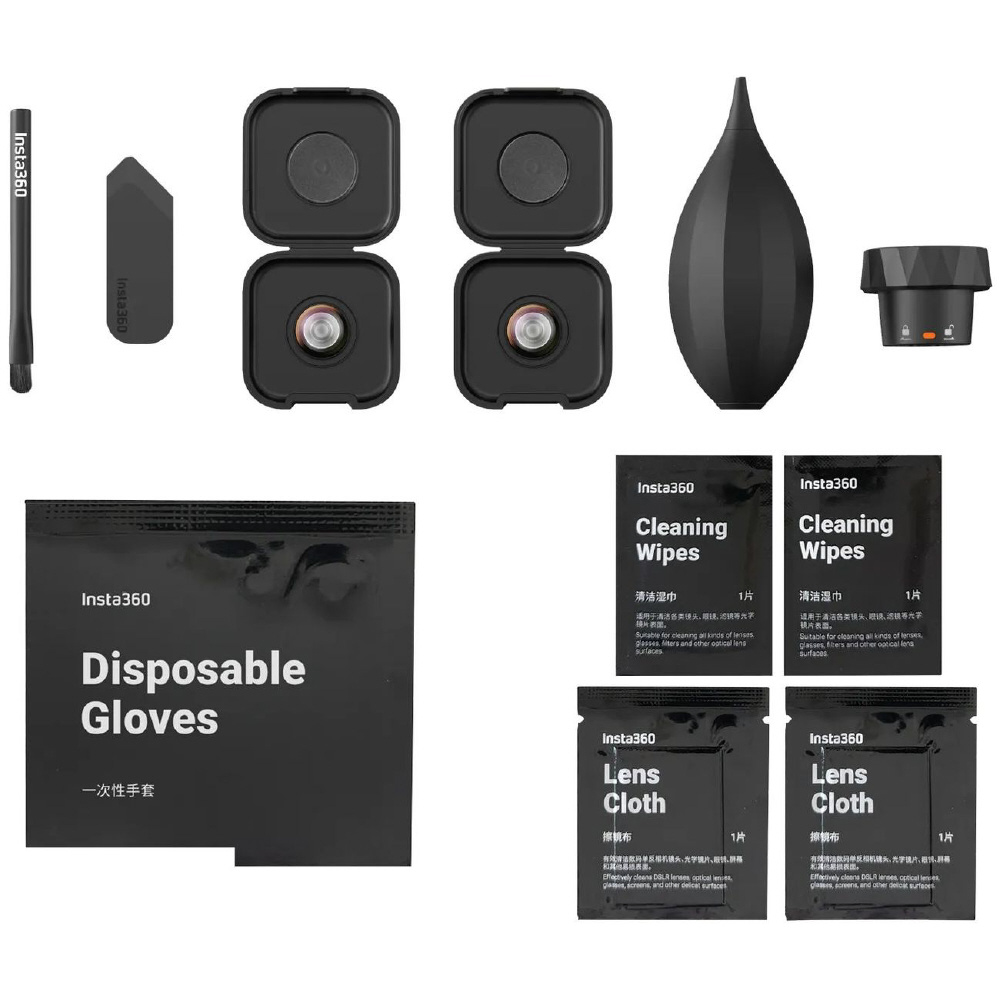 Insta360 X4 Air 純正交換レンズ2枚と、ご自宅でのレンズ交換やクリーニングに必要なツール一式が付属します。