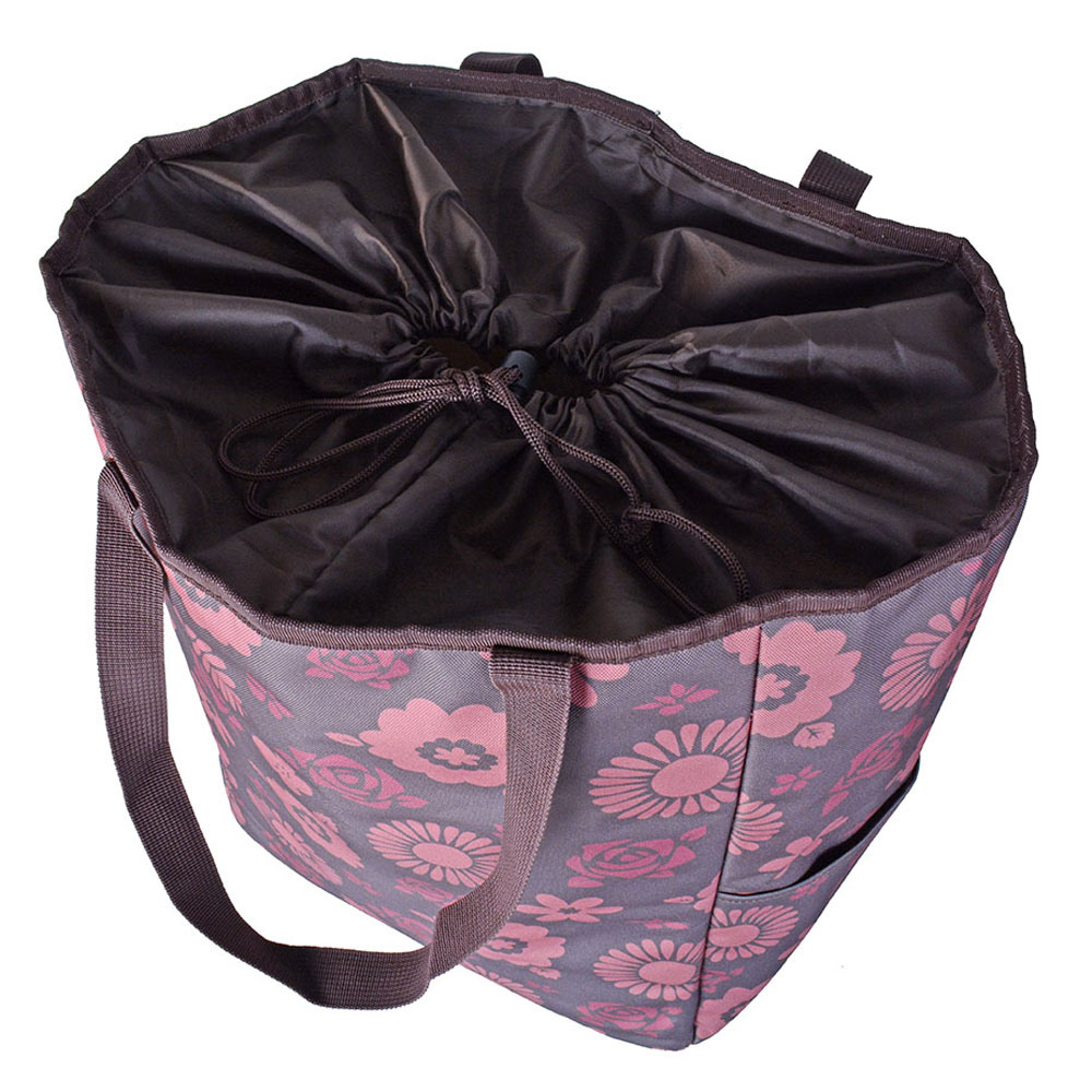 バッグはフレームから取り外し可。バッグ単体でも使用可能。バッグは巾着タイプなので、出し入れがしやすい。内装は保温・保冷仕様。2Lのペットボトルもしっかりと入ります。2Lのペットボトルが6本入る収納量。バッグ底面にある面ファスナーを使用し、キャリーに固定が可能。キャリー部分は、2つに折りたためます。