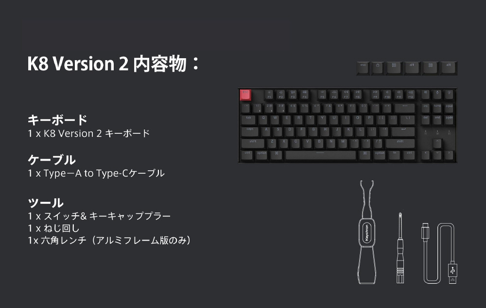 K8 Version 2は、TKL(80%)レイアウトのワイヤレスメカニカルキーボードです。Bluetooth 5.2および有線接続の両方に対応しています。QMKおよびKeychron Launcher Webアプリを通じてカスタマイズが可能で、無限の可能性を提供し、作業やゲームの生産性を向上させます!