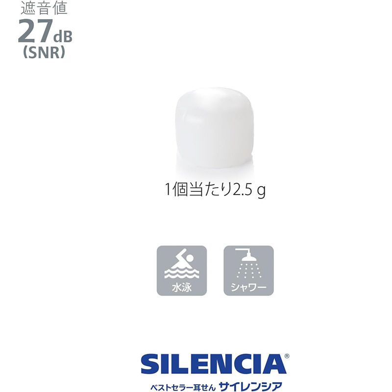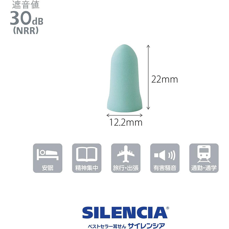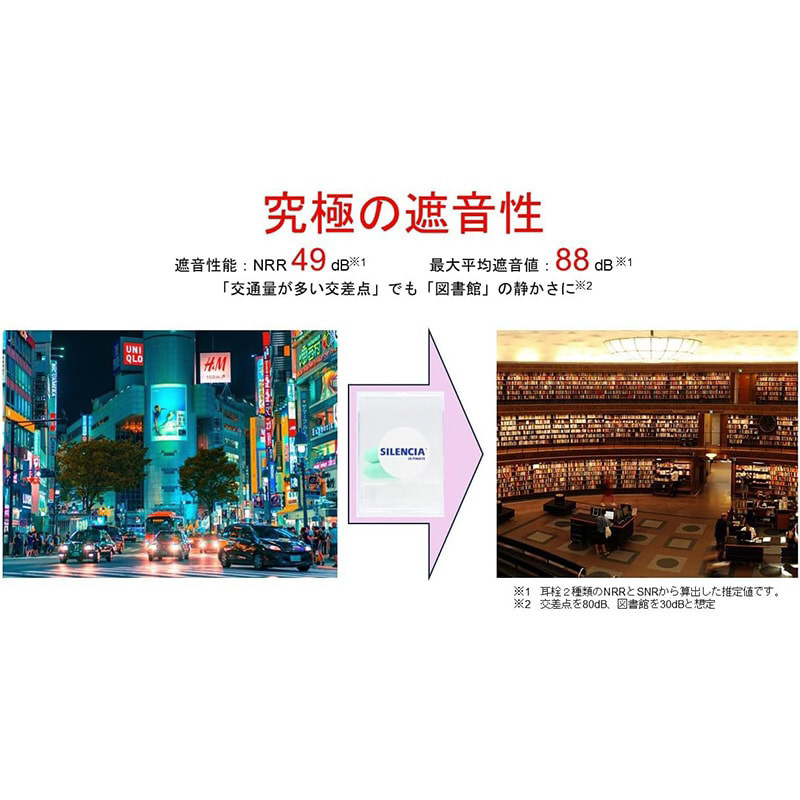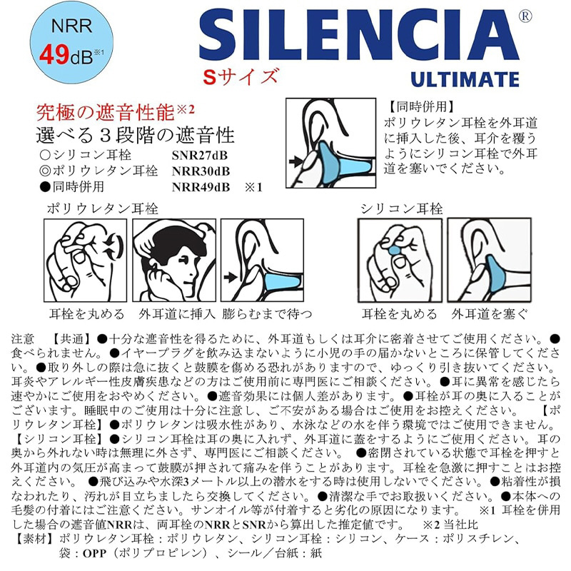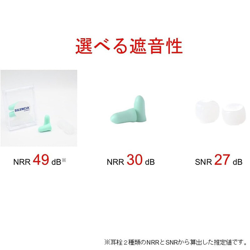 (ポリウレタン耳栓:NRR30dB、シリコン耳栓:SNR27dB)をお選びいただけます。