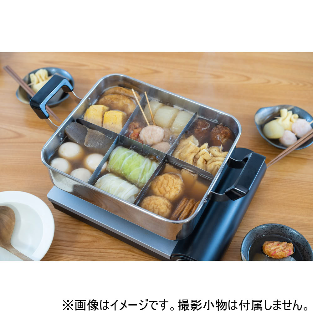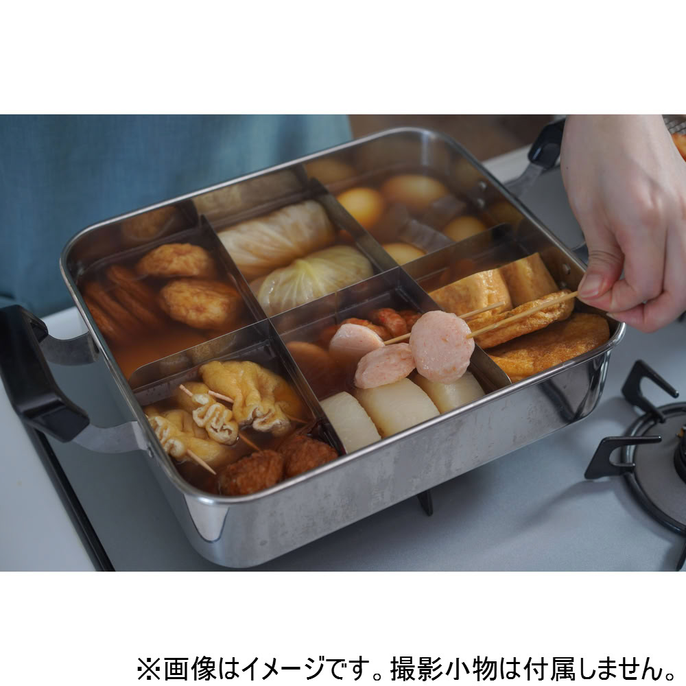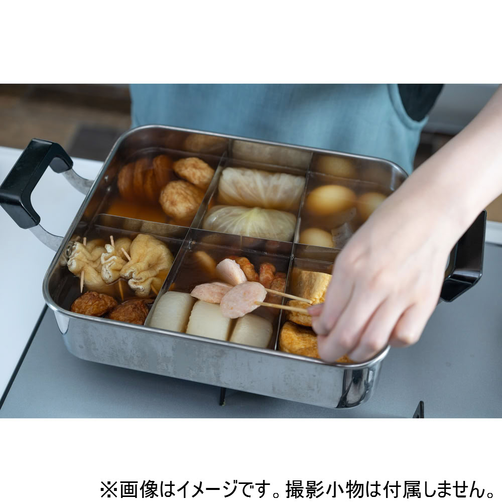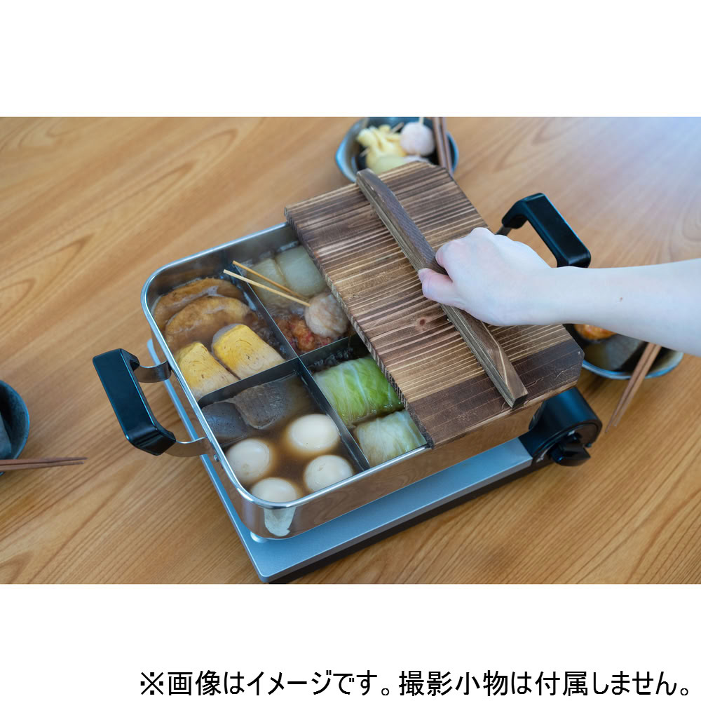 雰囲気満点の木蓋、角型の鍋形状、具材を分ける仕切りで、おでん屋台の雰囲気を自宅で楽しめます。