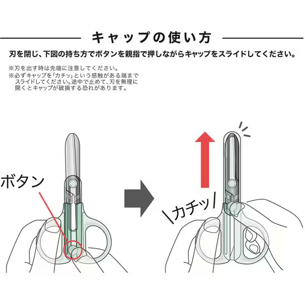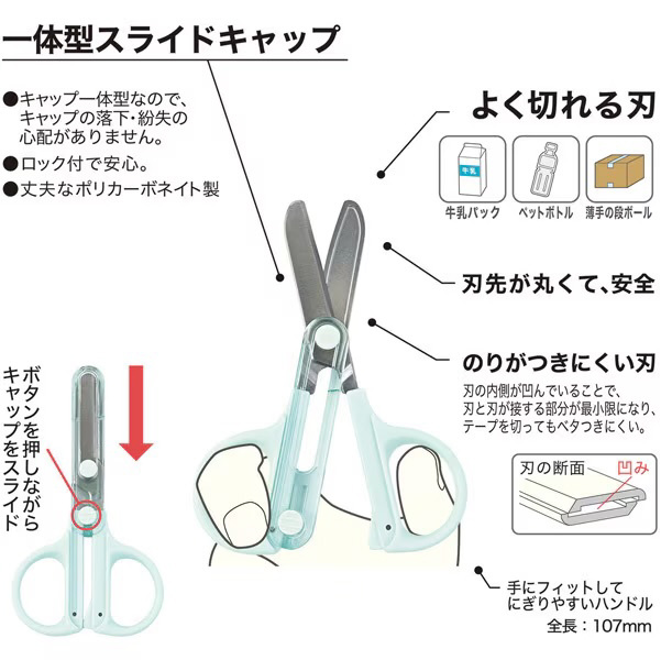「キャップ一体ハサミ」のコンパクトタイプが新発売。ハサミのキャップがスライド式で一体になっているので、なくす心配が有りません。刃先は丸く、糊がつきにくい刃になっています。