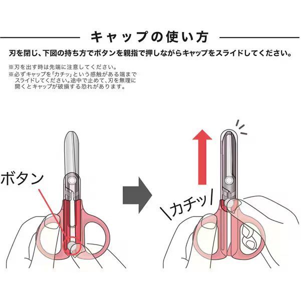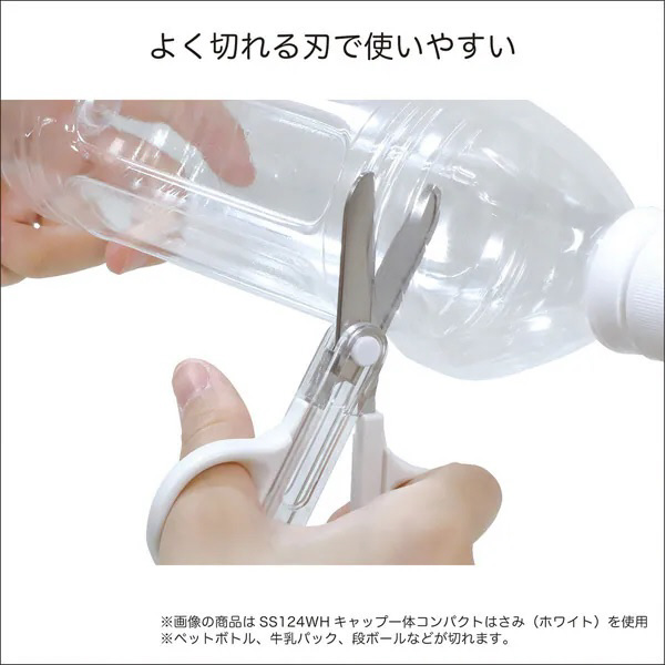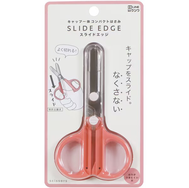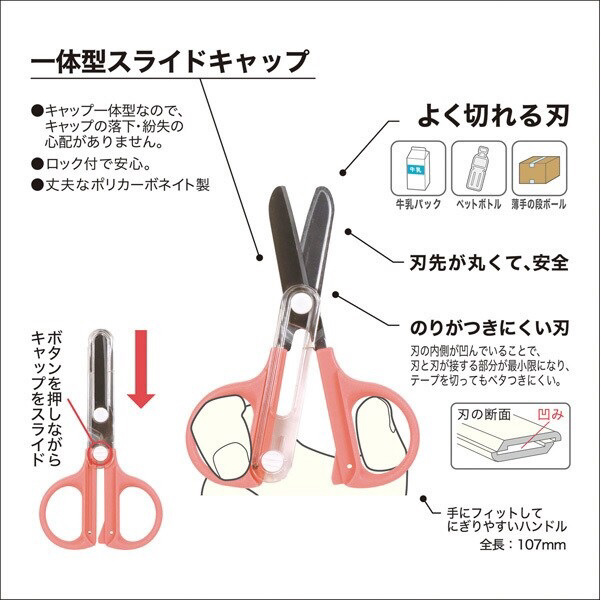 「キャップ一体ハサミ」のコンパクトタイプが新発売。ハサミのキャップがスライド式で一体になっているので、なくす心配が有りません。刃先は丸く、糊がつきにくい刃になっています。