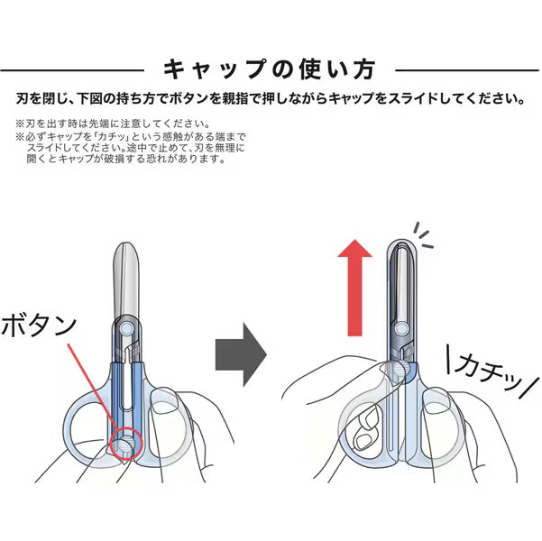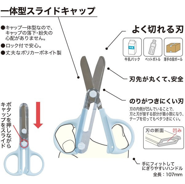 「キャップ一体ハサミ」のコンパクトタイプが新発売。ハサミのキャップがスライド式で一体になっているので、なくす心配が有りません。刃先は丸く、糊がつきにくい刃になっています。
