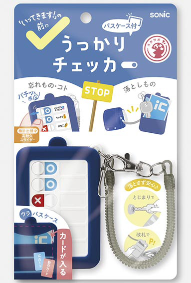 「うっかりチェッカーパスケース付 スパイラルチェーンで落とさない」は、「いってきます!」の前に、カンタンチェックでSTOP忘れ物。大事なものはウラ面のパスケースにまとめてSTOP落としもの。スパイラルチェーン付だから落とさず安心♪