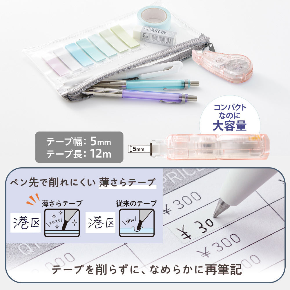 従来の修正テープは構造上、引くときにカチカチと音が発生しますが、本製品は「静音ギア」を搭載した独自の静音設計によってこの音をカット。携帯に便利なコンパクトサイズながら、テープの長さは12mの大容量。テープ交換式なので本体を繰り返し使用できます。