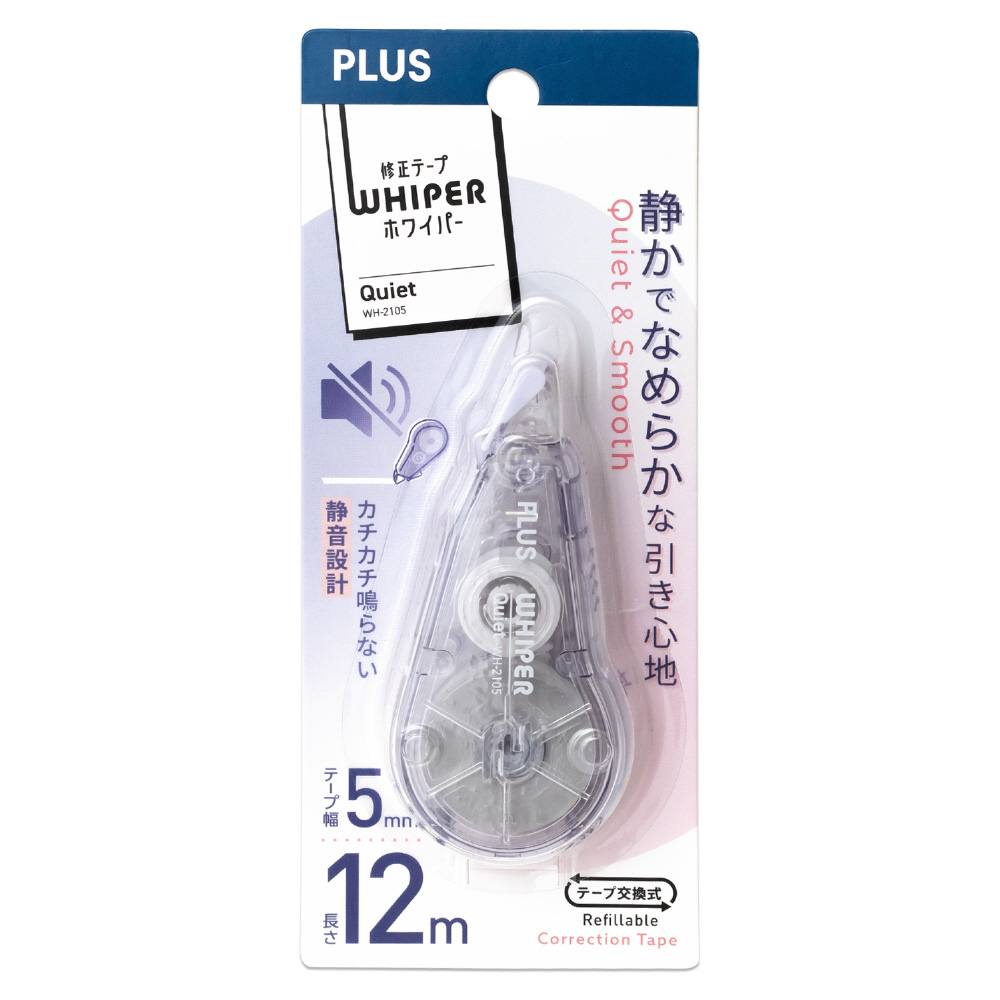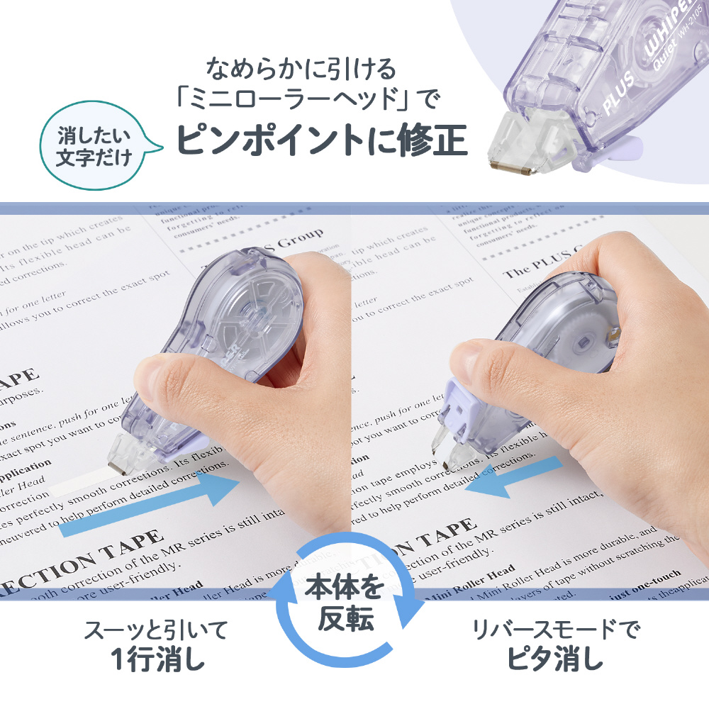 テープを引くときの音を約90%(※)カットした静音設計の修正テープ「ホワイパー クワイエット」。自習室や図書館、コワーキングスペースなどの静かな場所でも安心かつ快適に使うことができます。「ホワイパー」シリーズならではの「ミニローラーヘッド」や「薄さらテープ」による使いやすさや機能性はそのままに、静かでなめらかな引き心地を実現しました。※当社比、音圧パスカルでの比較