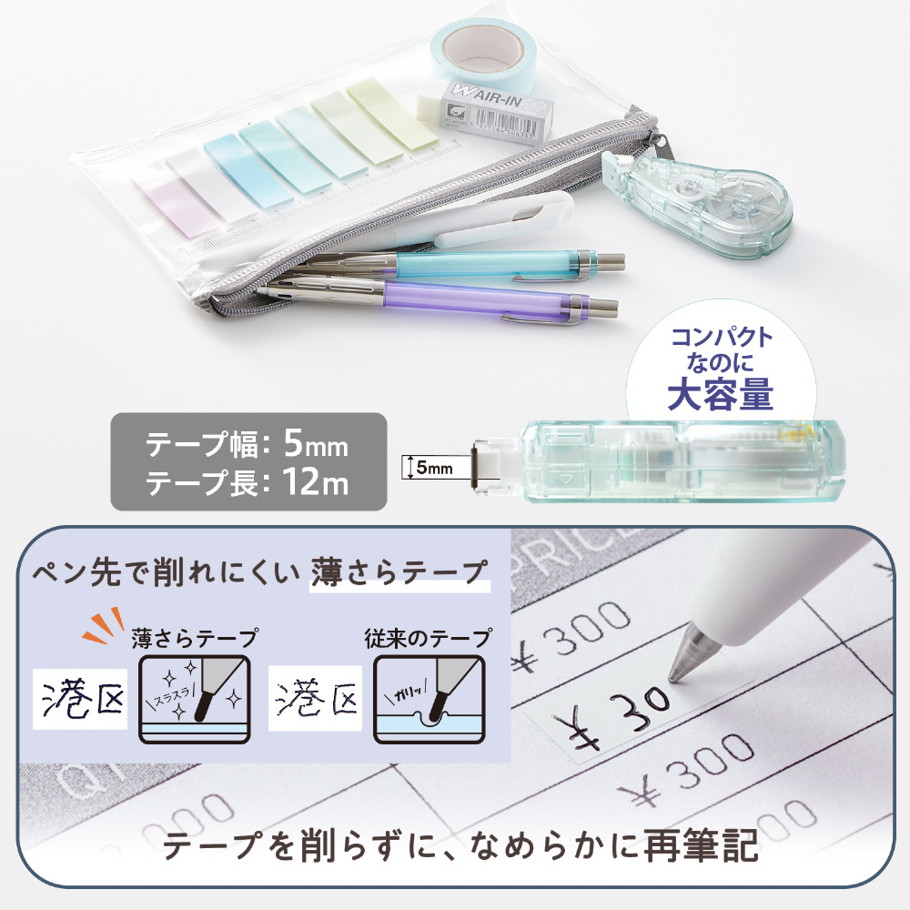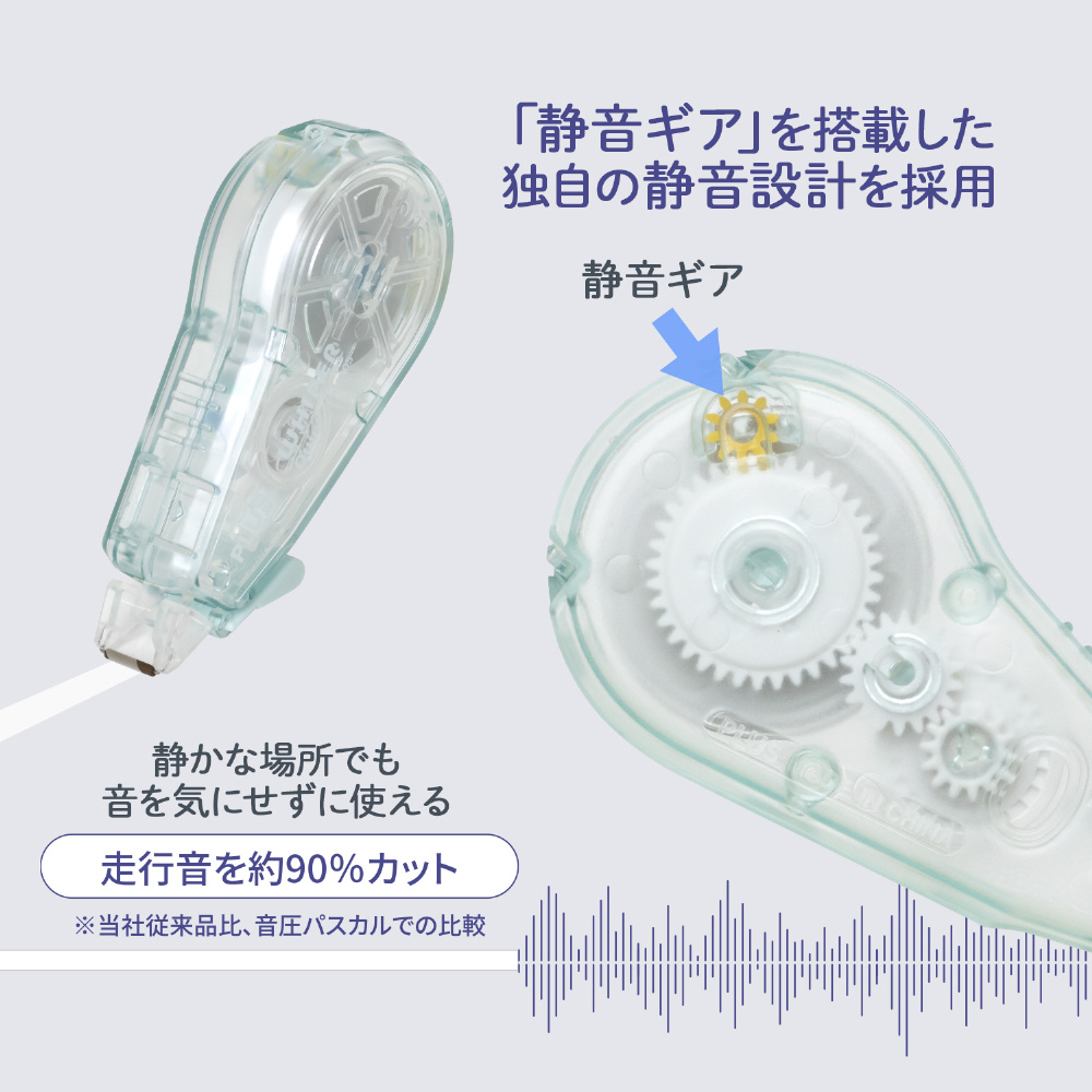 従来の修正テープは構造上、引くときにカチカチと音が発生しますが、本製品は「静音ギア」を搭載した独自の静音設計によってこの音をカット。携帯に便利なコンパクトサイズながら、テープの長さは12mの大容量。テープ交換式なので本体を繰り返し使用できます。