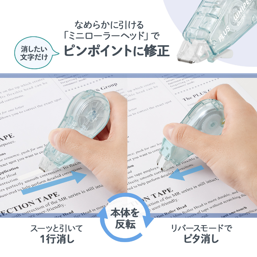 テープを引くときの音を約90%(※)カットした静音設計の修正テープ「ホワイパー クワイエット」。自習室や図書館、コワーキングスペースなどの静かな場所でも安心かつ快適に使うことができます。「ホワイパー」シリーズならではの「ミニローラーヘッド」や「薄さらテープ」による使いやすさや機能性はそのままに、静かでなめらかな引き心地を実現しました。※当社比、音圧パスカルでの比較