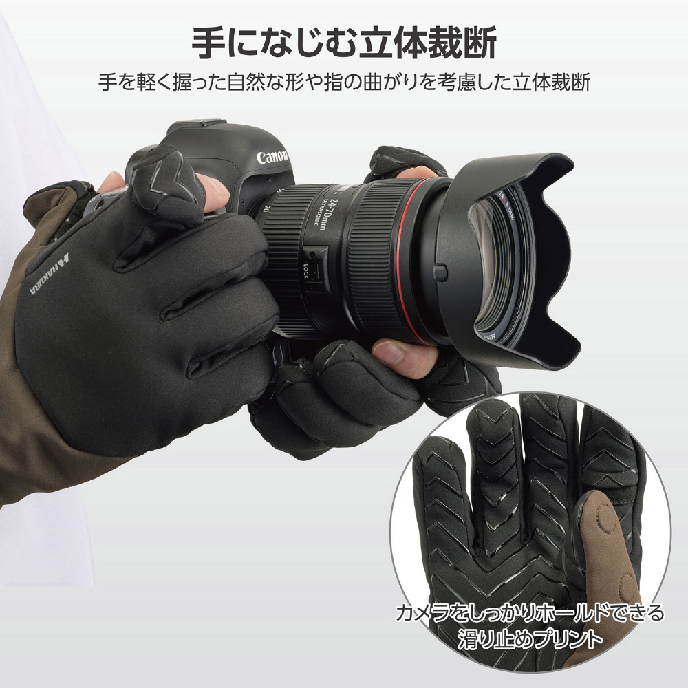 手を軽く握った自然な状態で形成された立体裁断フォルムにより、手の動きを妨げずスムーズにカメラの操作が可能。
