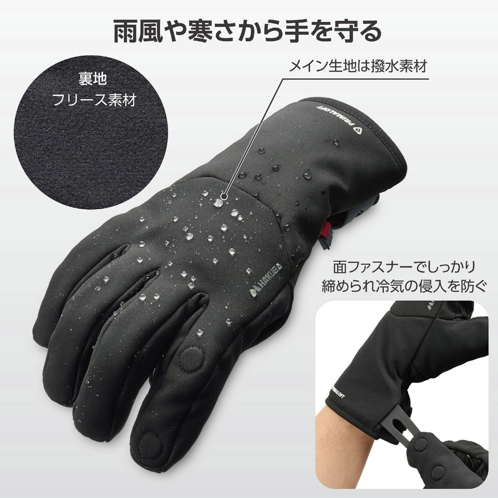 メイン生地には撥水加工、裏地には柔らかく温かいフリース素材を使用し、雨や寒さから手をしっかり守ります。