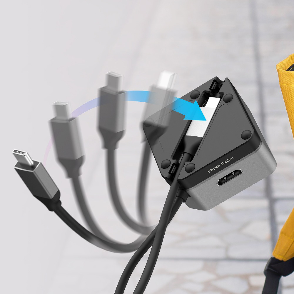DisplayPort Alt Mode対応のスマートフォンやノートPCに接続するだけで、映像出力・データ転送・充電を一括で実現。