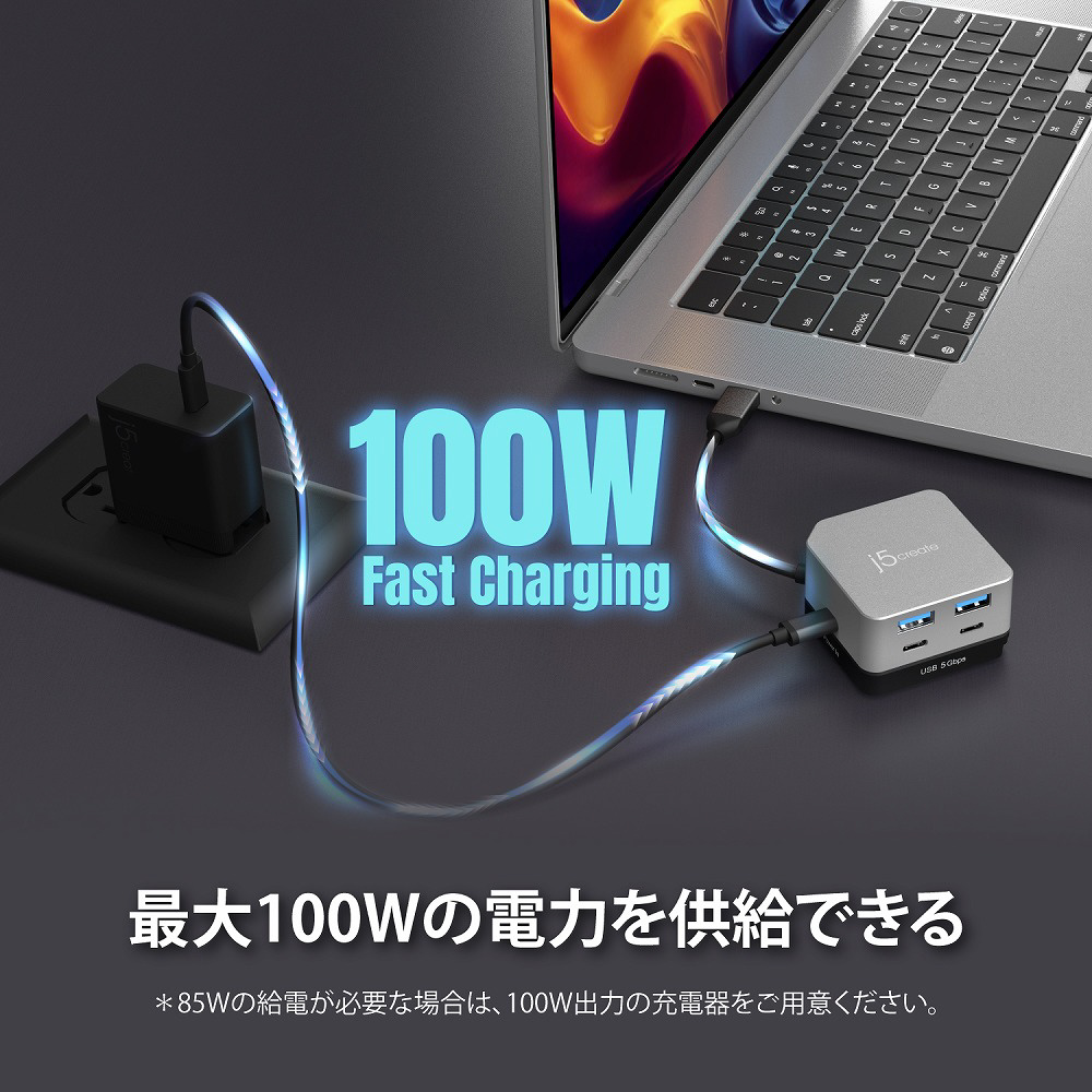 最大100Wのパワーデリバリーに対応し、USB-Cポート経由でノートPCやタブレットを急速充電。電力供給とデータ転送を同時にこなす高効率設計。