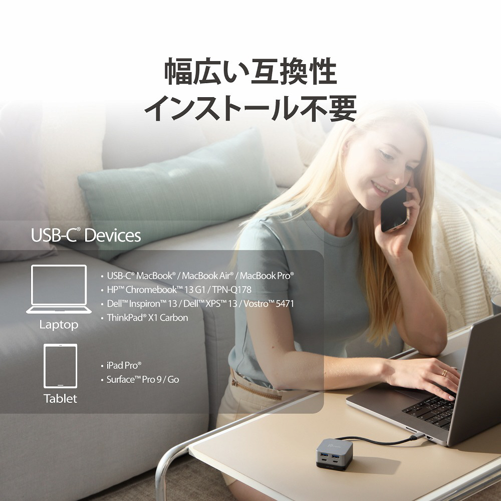 MacBook、Windows PC、Chromebookなど主要OSに対応。ドライバー不要で接続するだけですぐに使える手軽さも魅力。