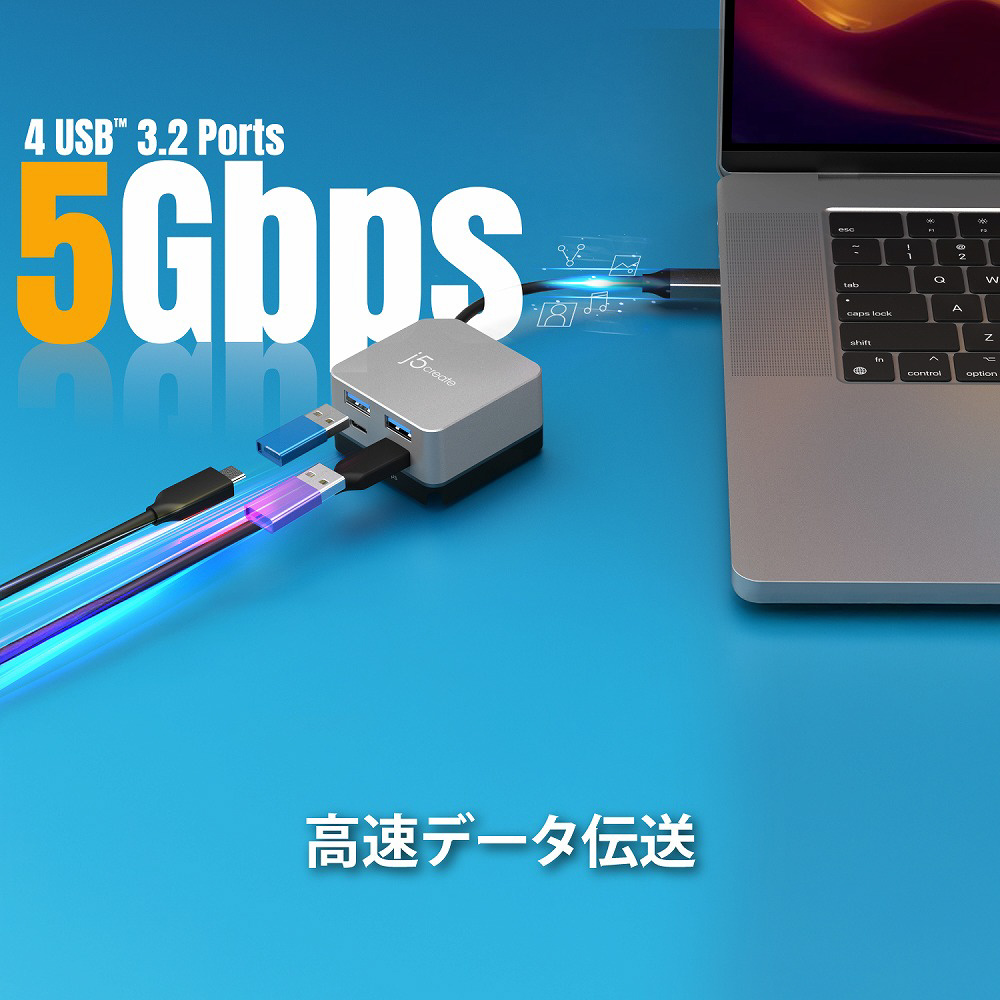 Type-A×2、Type-C×2の合計4ポートを搭載。最大5Gbpsの高速転送で、外付けSSDやUSBメモリ、マウス・キーボードなどを同時接続可能。