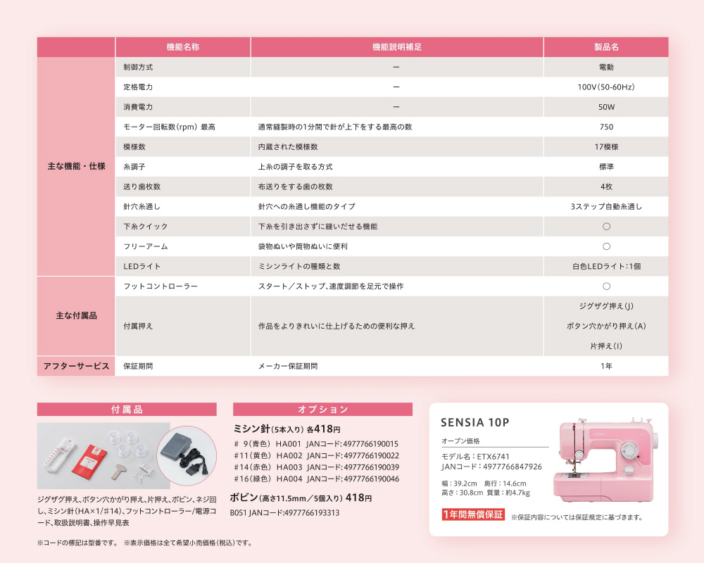 ジグザグ押え、ボタン穴かがり押え、片押え、ボビン、ネジ回し、ミシン針、フットコントローラー/電源コード、取扱説明書、操作早見表