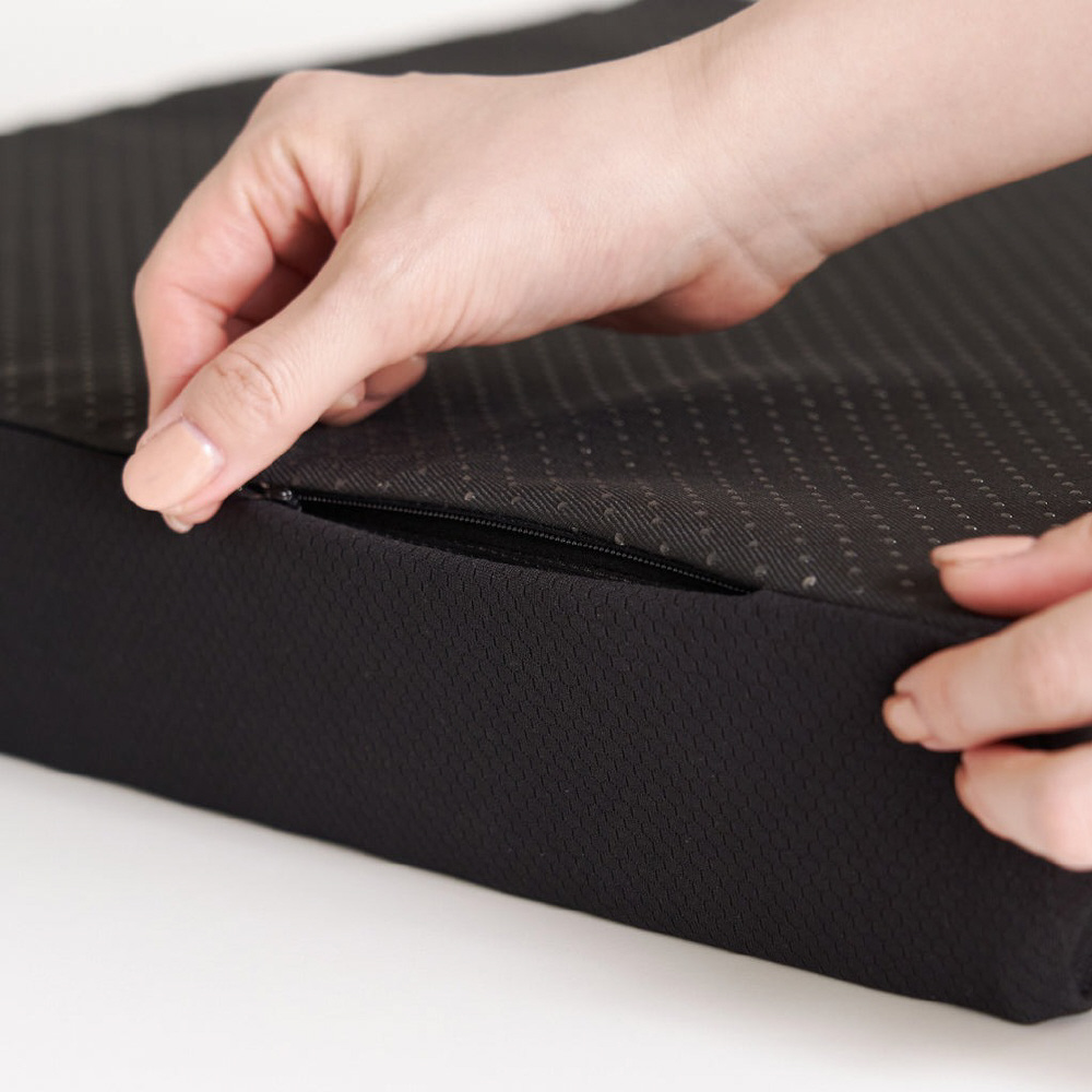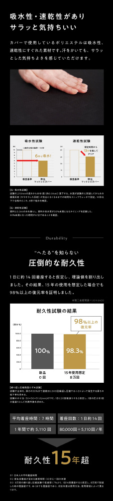 カバーはポリエステル100%でサラッと気持ちいい肌触りに。通気性、吸水速乾性、洗濯耐久性も兼ねそなえており、機能面にも徹底的にこだわりました。