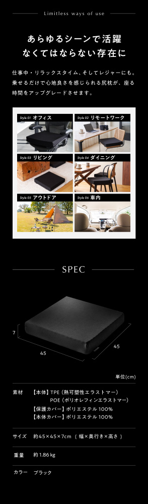 TPEとPOEのハイブリッド構造にすることで、約7cmのたっぷりとした厚みにしました。座っても底つき感がなく、”ぷにょん”とした心地良さを体感できます。