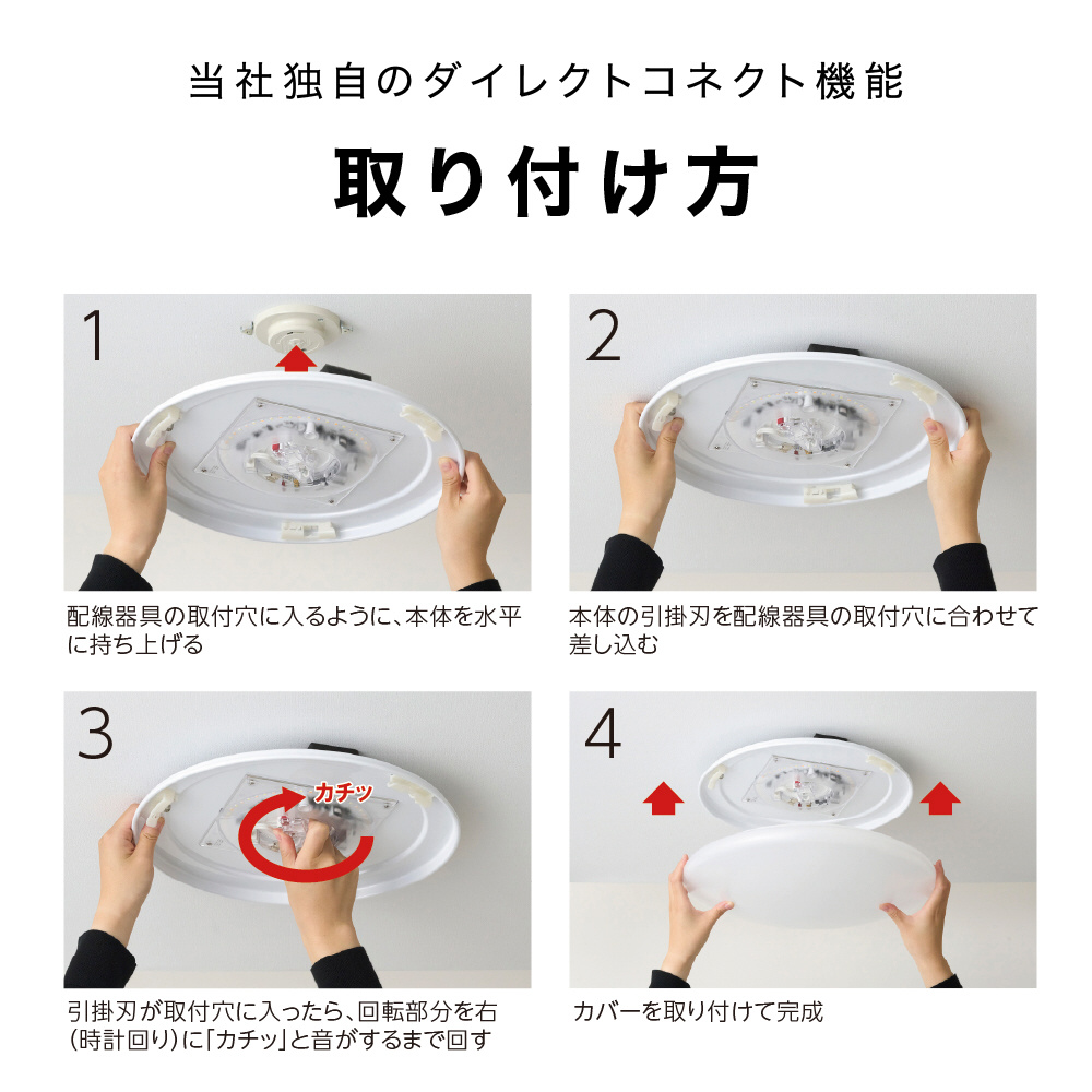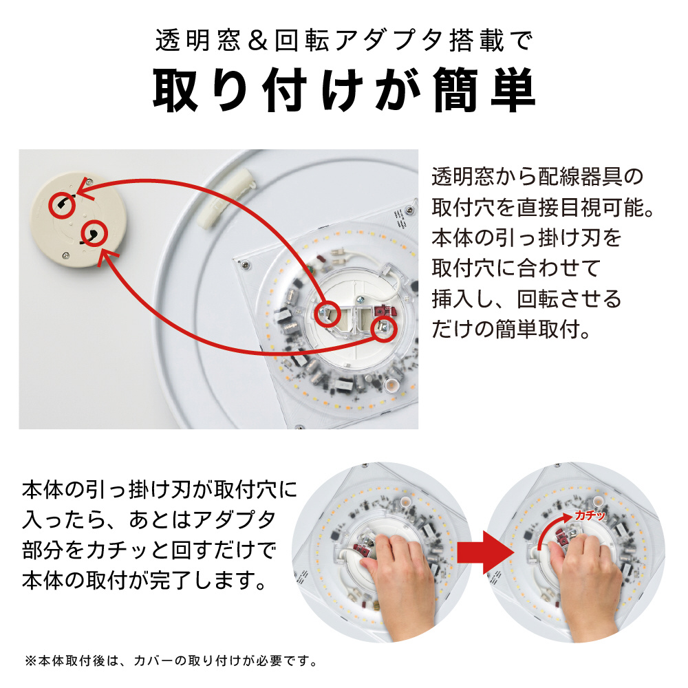 「新開発の透明アダプタ搭載」により、「天井の配線器具が直接見える」ので簡単に設置することができます。